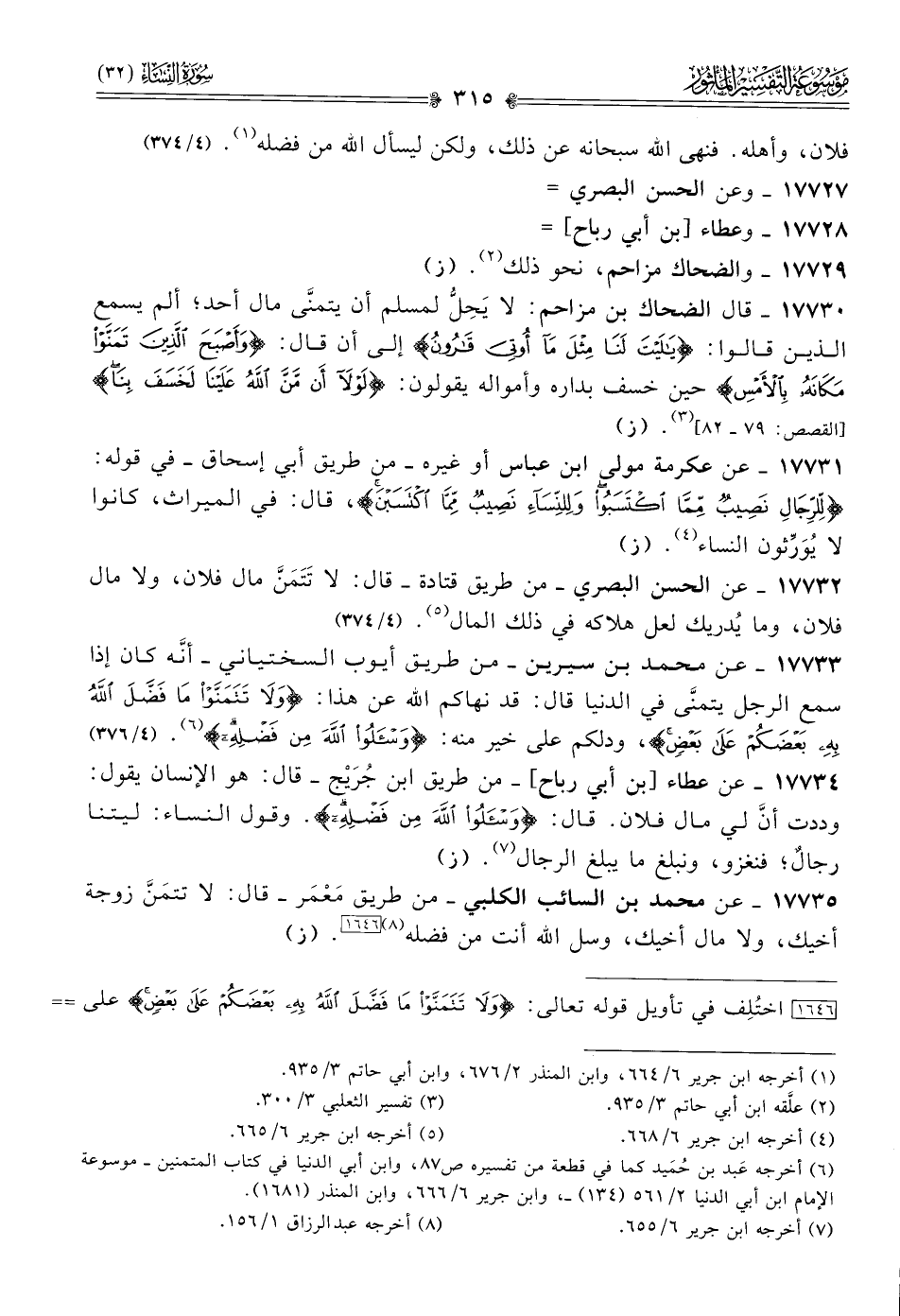 [١٦٤٦] اختُلِف في تأويل قوله تعالى: {ولا تتمنوا ما فضل الله به بعضكم على بعض} على قولين: أحدهما: أنّ معناه: ولا تشتهوا ما فضل الله به بعضكم على بعض. وذكر أنّ ذلك نزل في نساءٍ تَمَنَّيْن منازلَ الرجال، وأن يكون لهم ما لهم، فنهى اللهُ عباده عن الأماني الباطلة، وأمرهم أن يسألوه من فضله؛ إذ كانت الأماني تورِث أهلها الحسدَ والبغي بغير الحق. وقد ذَهَبَإليه ابن جرير (٦/ ٦٦٣) مستندًا إلى أقوال السلف. والآخر: أنّ معنى ذلك: لا يتمنَّ بعضكم ما خصَّ الله بعضًا من منازل الفضل. فتأويل الكلام على هذا التأويل: ولا تتمنوا أيها الرجال والنساء الذي فضل الله به بعضكم على بعض من منازل الفضل ودرجات الخير، وليرض أحدكم بما قسم الله له من نصيب، ولكن سَلُوا الله من فضله.