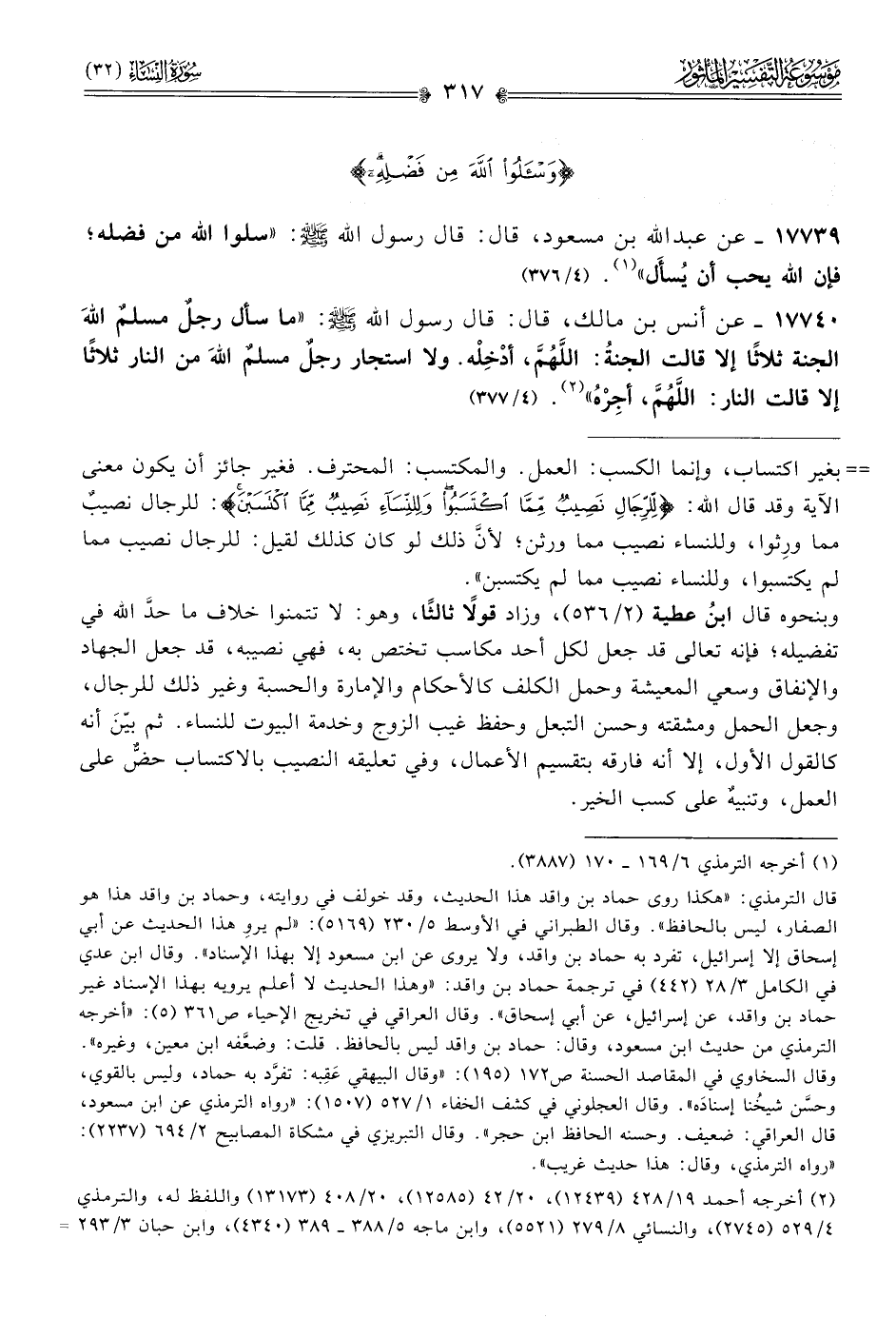 قال الترمذي: «هكذا روى حماد بن واقد هذا الحديث، وقد خولف في روايته، وحماد بن واقد هذا هو الصفار، ليس بالحافظ». وقال الطبراني في الأوسط ٥/ ٢٣٠ (٥١٦٩): «لم يروِ هذا الحديث عن أبي إسحاق إلا إسرائيل، تفرد به حماد بن واقد، ولا يروى عن ابن مسعود إلا بهذا الإسناد». وقال ابن عدي في الكامل ٣/ ٢٨ (٤٤٢) في ترجمة حماد بن واقد: «وهذا الحديث لا أعلم يرويه بهذا الإسناد غير حماد بن واقد، عن إسرائيل، عن أبي إسحاق». وقال العراقي في تخريج الإحياء ص ٣٦١ (٥): «أخرجه الترمذي من حديث ابن مسعود، وقال: حماد بن واقد ليس بالحافظ. قلت: وضعَّفه ابن معين، وغيره». وقال السخاوي في المقاصد الحسنة ص ١٧٢ (١٩٥): «وقال البيهقي عَقِبه: تفرَّد به حماد، وليس بالقوي، وحسَّن شيخُنا إسنادَه». وقال العجلوني في كشف الخفاء ١/ ٥٢٧ (١٥٠٧): «رواه الترمذي عن ابن مسعود، قال العراقي: ضعيف. وحسنه الحافظ ابن حجر». وقال التبريزي في مشكاة المصابيح ٢/ ٦٩٤ (٢٢٣٧): «رواه الترمذي، وقال: هذا حديث غريب».