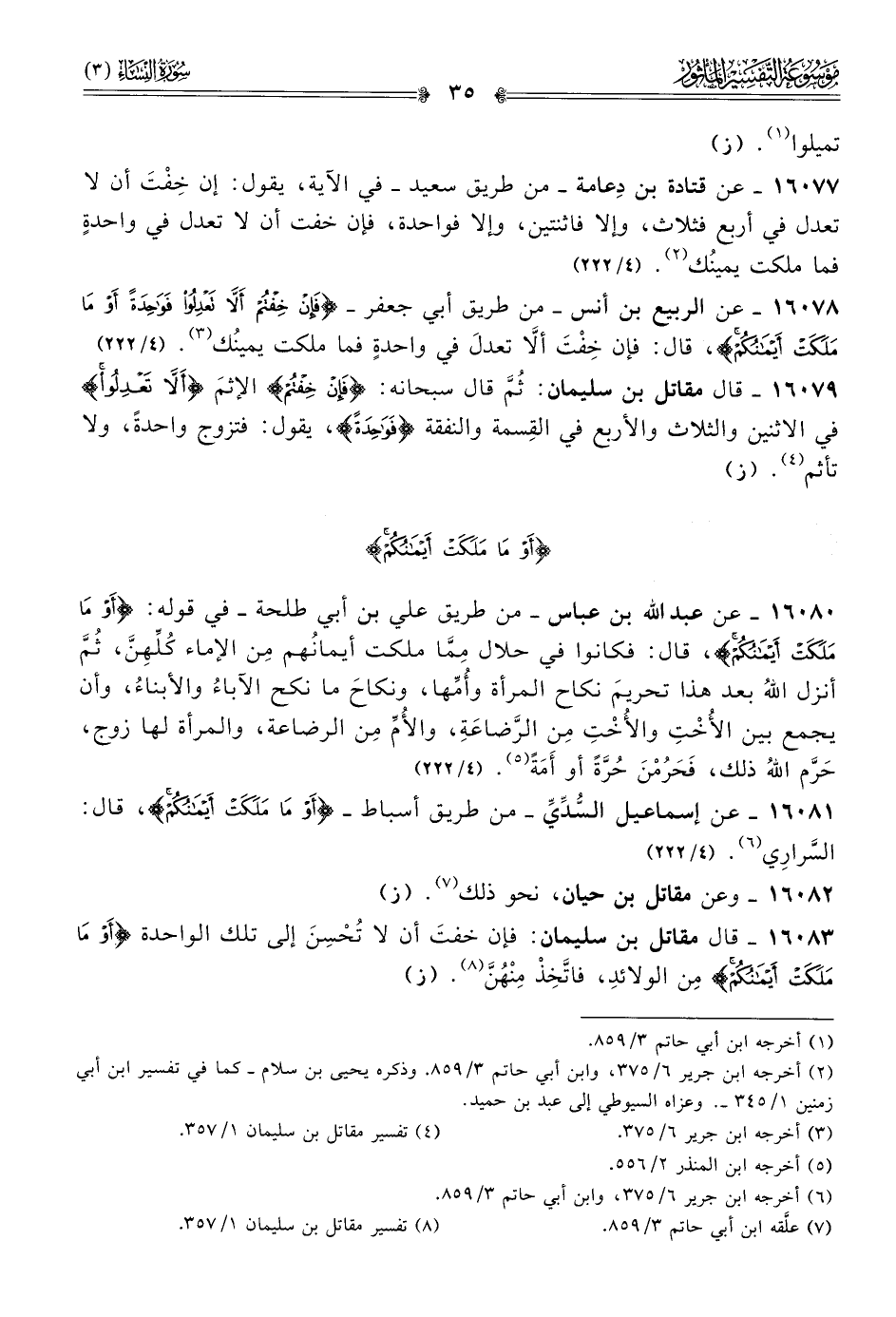 ١٦٠٨١ - عن إسماعيل السُّدِّيِّ -من طريق أسباط- {أو ما ملكت أيمانكم}، قال: السَّرارِي (¬٦). (٤/ ٢٢٢)