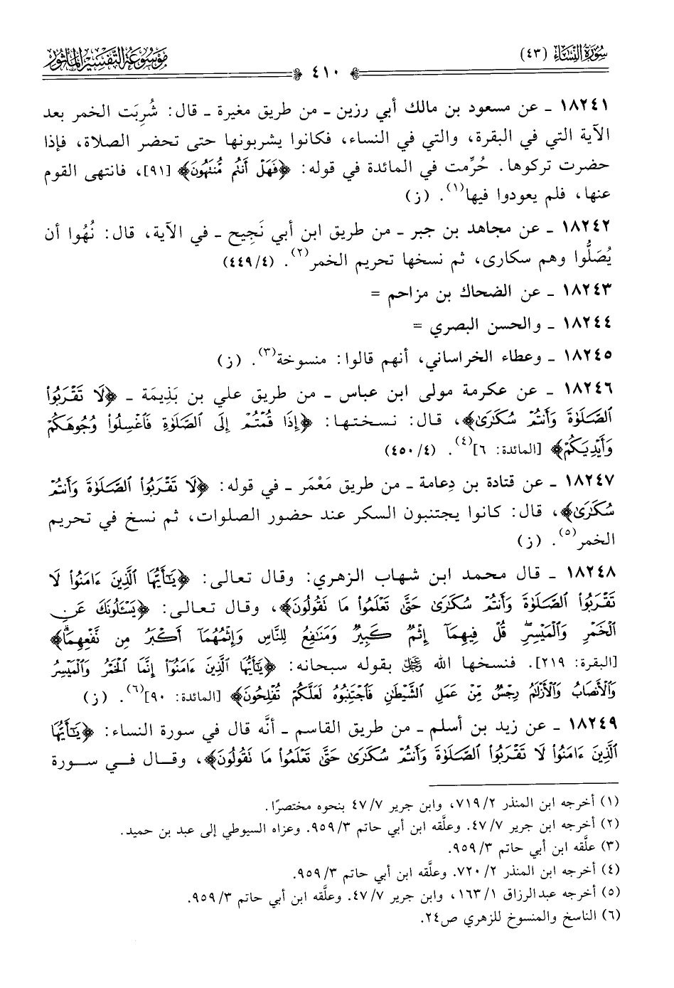 ١٨٢٤٢ - عن مجاهد بن جبر -من طريق ابن أبي نَجِيح- في الآية، قال: نُهُوا أن يُصَلُّوا وهم سكارى، ثم نسخها تحريم الخمر (¬٢). (٤/ ٤٤٩)