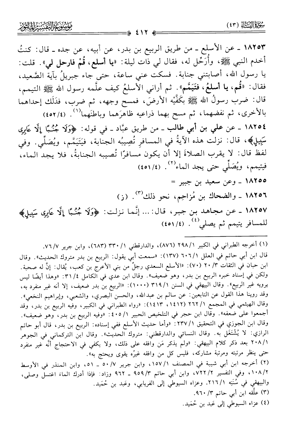 ١٨٢٥٤ - عن علي بن أبي طالب -من طريق عبّاد- في قوله: {ولا جنبا إلا عابري سبيل}، قال: نزلت هذه الآيةُ في المسافرِ تُصِيبُه الجنابة، فيَتَيَمَّم، ويُصَلِّي. وفي لفظ قال: لا يقرب الصلاةَ إلا أن يكون مسافرًا تُصيبه الجنابةُ، فلا يجد الماء، فيتيمم، ويُصَلِّي حتى يجد الماء (¬٢). (٤/ ٤٥١)