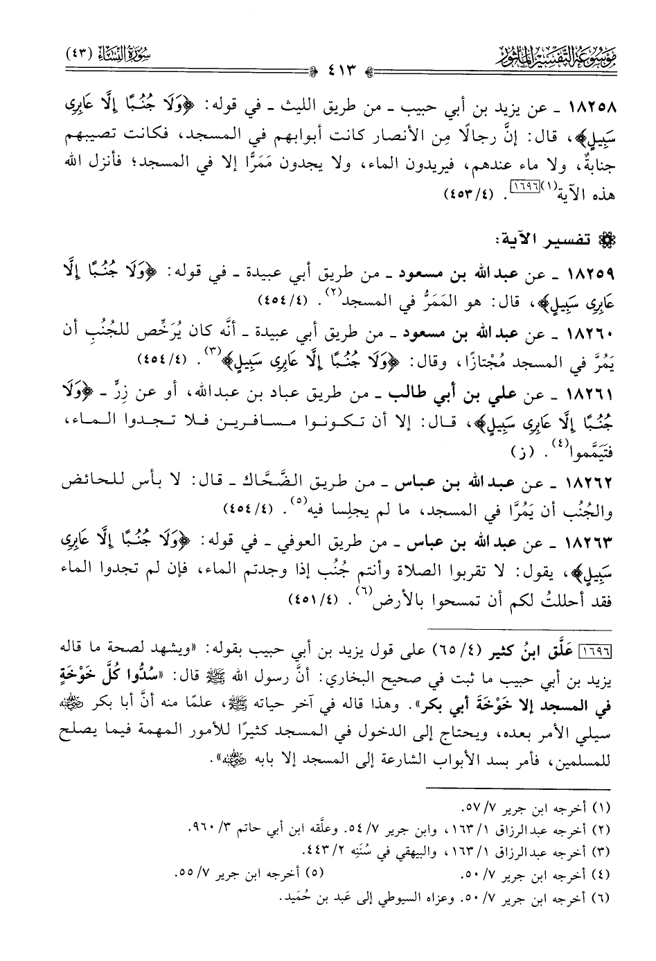١٨٢٥٨ - عن يزيد بن أبي حبيب -من طريق الليث- في قوله: {ولا جنبا إلا عابري سبيل}، قال: إنّ رجالًا مِن الأنصار كانت أبوابهم في المسجد، فكانت تصيبهم جنابةٌ، ولا ماء عندهم، فيريدون الماء، ولا يجدون مَمَرًّا إلا في المسجد؛ فأنزل الله هذه الآية (¬١) [١٦٩٦]. (٤/ ٤٥٣)