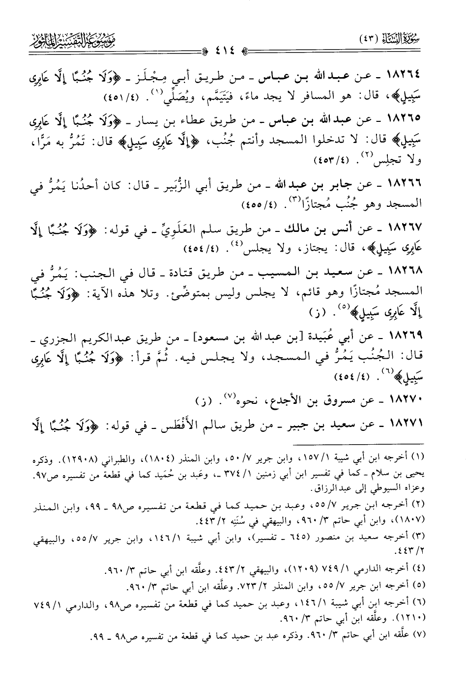١٨٢٦٥ - عن عبد الله بن عباس -من طريق عطاء بن يسار- {ولا جنبا إلا عابري سبيل} قال: لا تدخلوا المسجد وأنتم جُنُب، {إلا عابري سبيل} قال: تَمُرُّ به مَرًّا، ولا تجلِس (¬٢). (٤/ ٤٥٣)