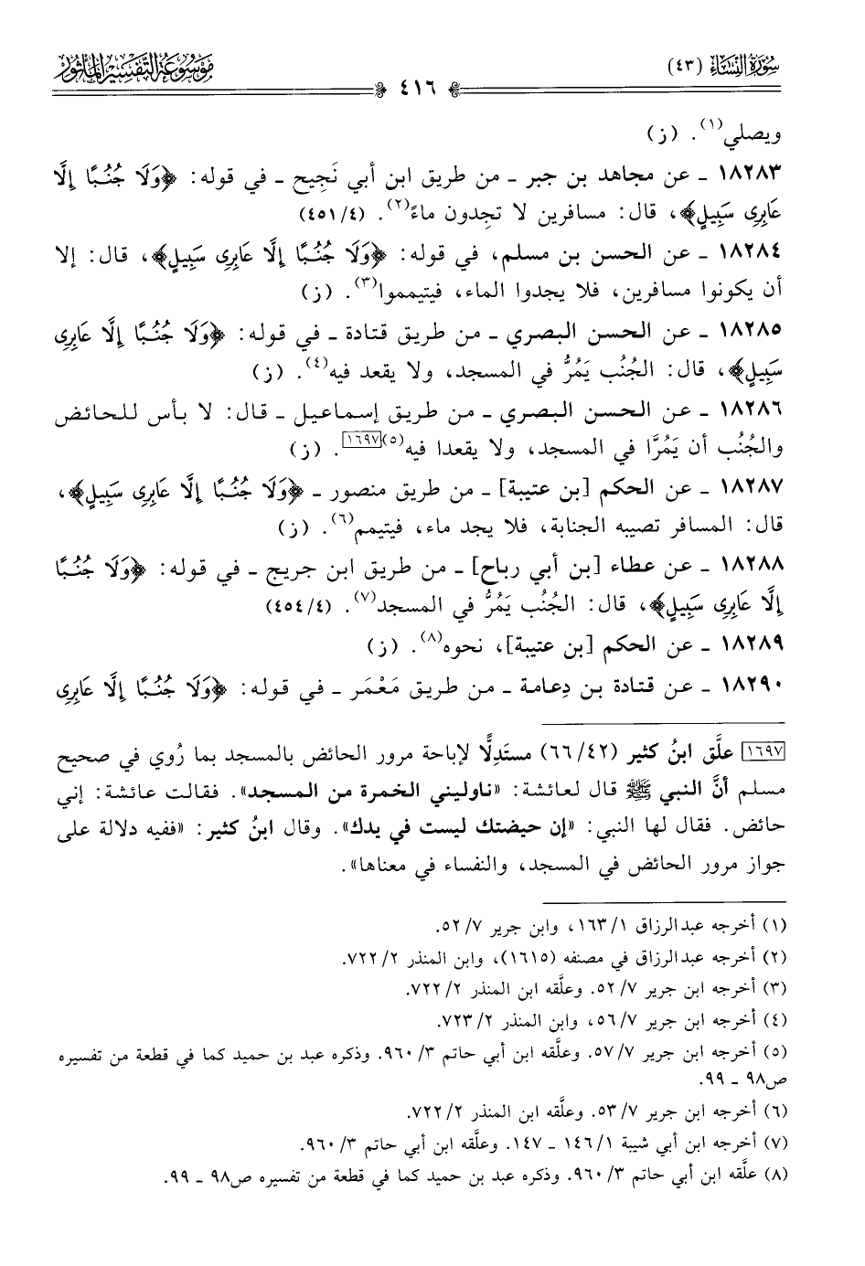 [١٦٩٧] علَّق ابنُ كثير (٤٢/ ٦٦) مُسْتَدِلًّا لإباحة مرور الحائض بالمسجد بما رُوي في صحيح مسلم أنّ النبي - صلى الله عليه وسلم - قال لعائشة: «ناوليني الخمرة من المسجد». فقالت عائشة: إني حائض. فقال لها النبي: «إن حيضتك ليست في يدك». وقال ابنُ كثير: «ففيه دلالة على جواز مرور الحائض في المسجد، والنفساء في معناها».