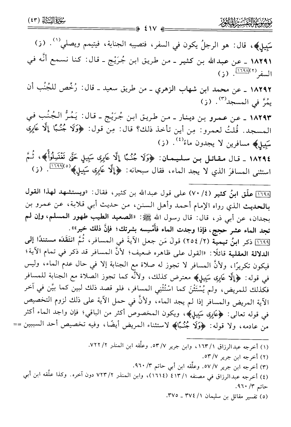 ١٨٢٩٤ - قال مقاتل بن سليمان: {ولا جنبا إلا عابري سبيل حتى تغتسلوا}، ثُمَّ استثنى المسافرَ الذي لا يجد الماء، فقال سبحانه: {إلا عابري سبيل} (¬٥) [١٦٩٩]. (ز)