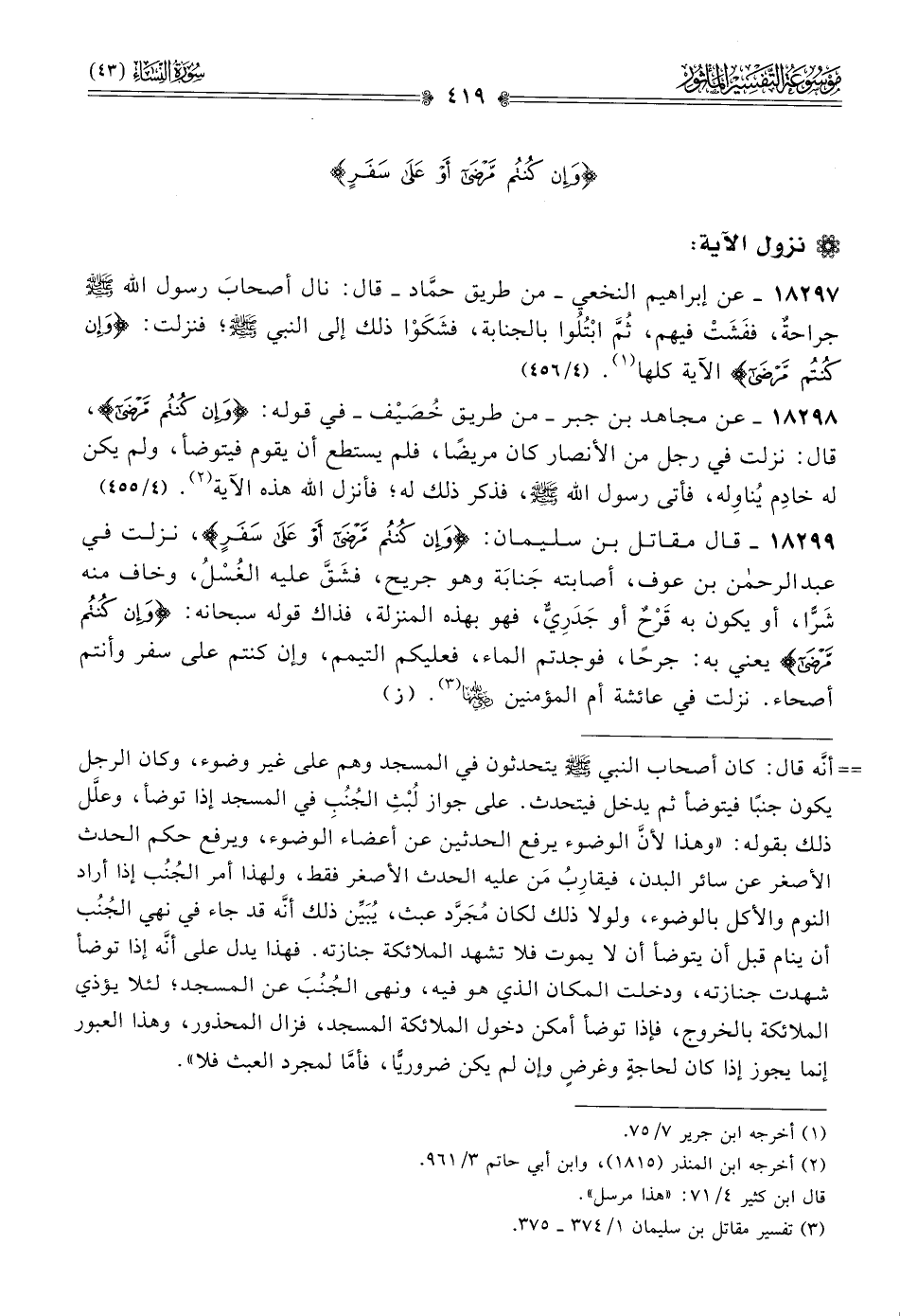 ١٨٢٩٧ - عن إبراهيم النخعي -من طريق حمّاد- قال: نال أصحابَ رسول الله - صلى الله عليه وسلم - جراحةٌ، ففَشَتْ فيهم، ثُمَّ ابْتُلُوا بالجنابة، فشَكَوْا ذلك إلى النبي - صلى الله عليه وسلم -؛ فنزلت: {وإن كنتم مرضى} الآية كلها (¬١). (٤/ ٤٥٦)