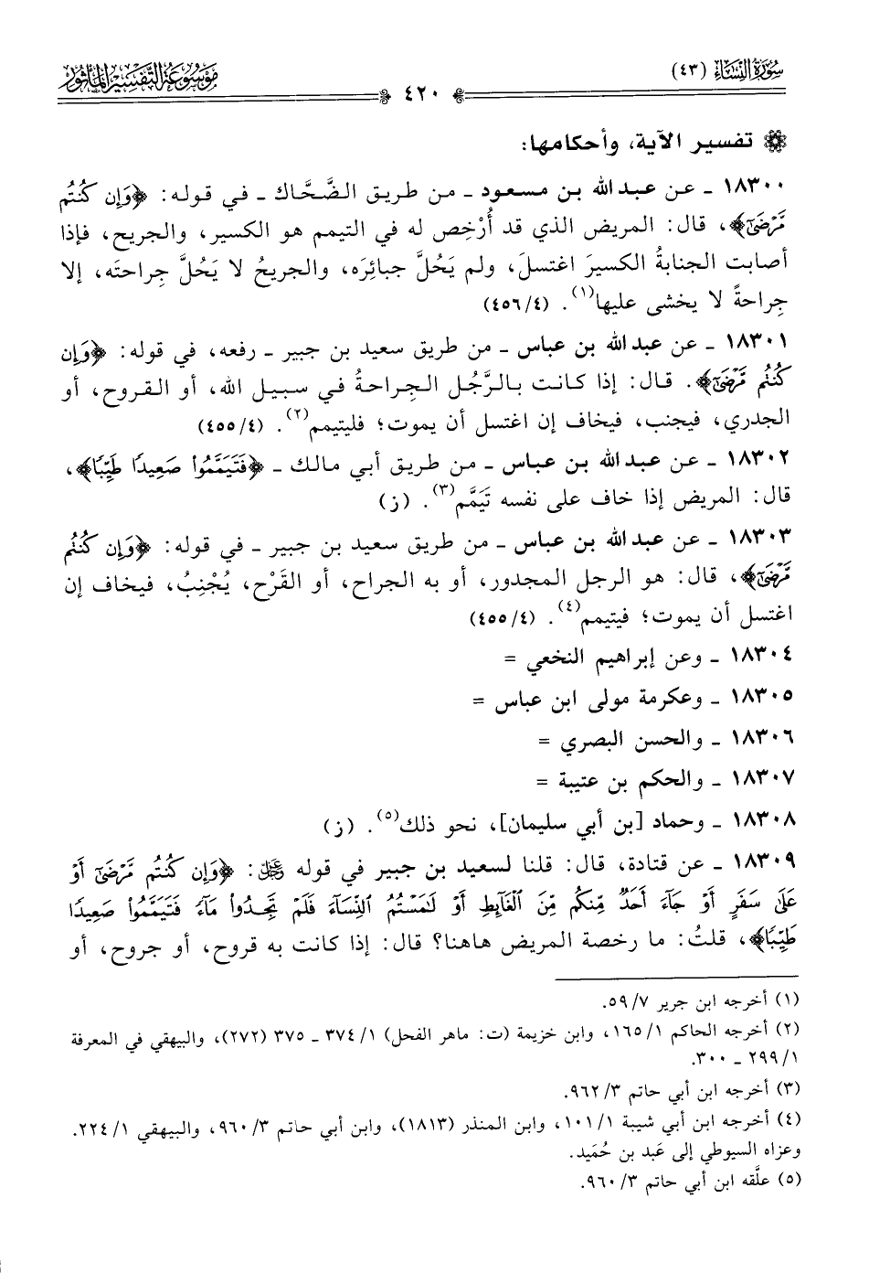 ١٨٣٠٣ - عن عبد الله بن عباس -من طريق سعيد بن جبير- في قوله: {وإن كنتم مرضى}، قال: هو الرجل المجدور، أو به الجراح، أو القَرْح، يُجْنِبُ، فيخاف إن اغتسل أن يموت؛ فيتيمم (¬٤). (٤/ ٤٥٥)