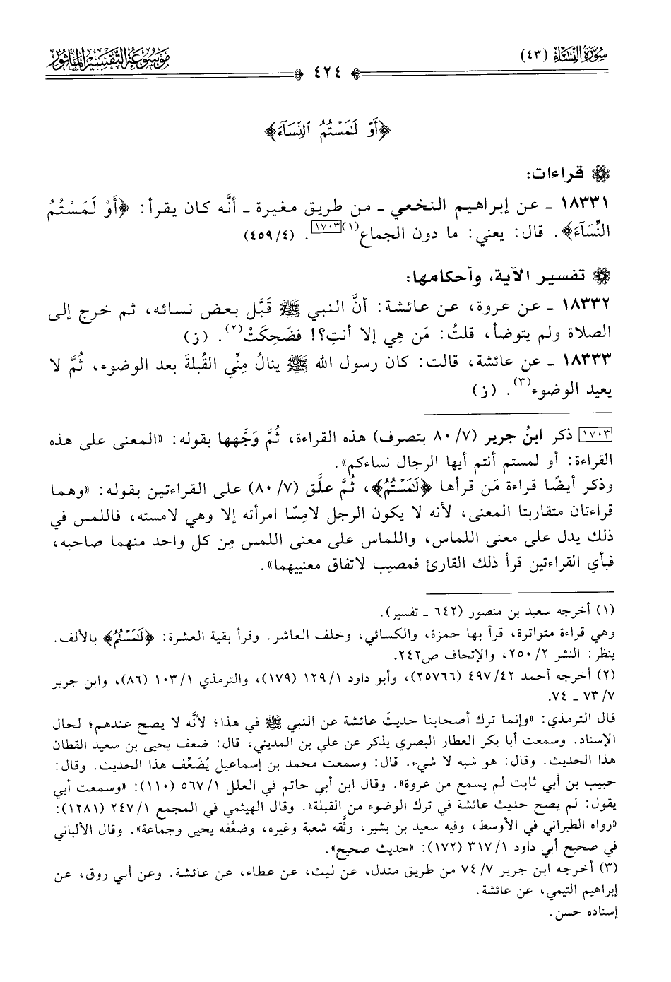 ١٨٣٣١ - عن إبراهيم النخعي -من طريق مغيرة- أنّه كان يقرأ: «أوْ لَمَسْتُمُ النِّسَآءَ». قال: يعني: ما دون الجماع (¬١) [١٧٠٣]. (٤/ ٤٥٩)
