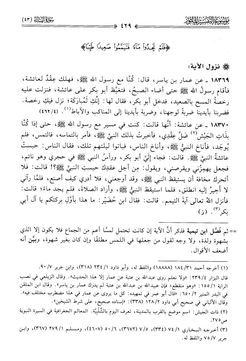 (¬٣) أخرجه البخاري ١/ ٧٤ (٣٣٤)، ٥/ ٧ (٣٦٧٢)، ٦/ ٥٠ (٤٦٠٧)، ومسلم ١/ ٢٧٩ (٣٦٧)، وابن جرير ٧/ ٧٥ واللفظ له.