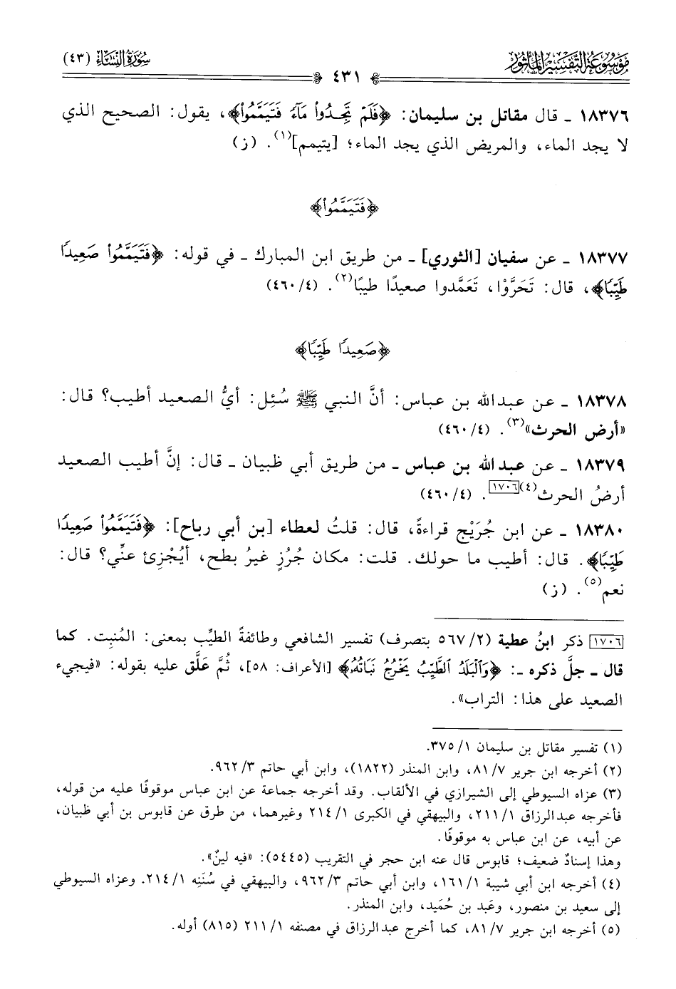 ١٨٣٧٧ - عن سفيان [الثوري]-من طريق ابن المبارك- في قوله: {فتيمموا صعيدا طيبا}، قال: تَحَرَّوْا، تَعَمَّدوا صعيدًا طيبًا (¬٢). (٤/ ٤٦٠)