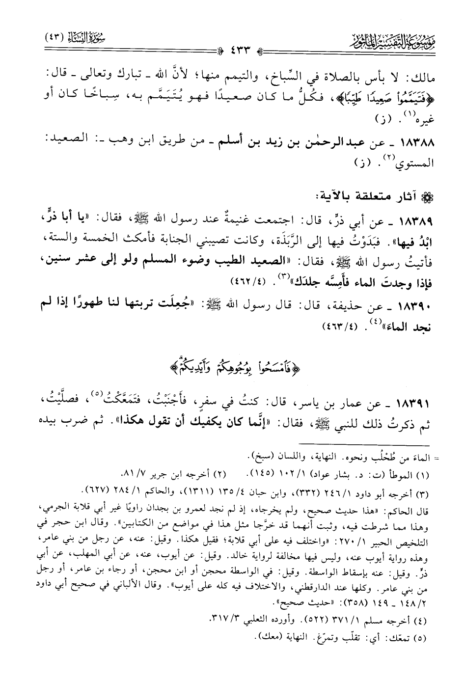 ١٨٣٨٩ - عن أبي ذرٍّ، قال: اجتمعت غنيمةٌ عند رسول الله - صلى الله عليه وسلم -، فقال: «يا أبا ذرٍّ، ابْدُ فيها». فبَدَوْتُ فيها إلى الرَّبَذَة، وكانت تصيبني الجنابة فأمكث الخمسة والستة، فأتيتُ رسول الله - صلى الله عليه وسلم -، فقال: «الصعيد الطيب وضوء المسلم ولو إلى عشر سنين، فإذا وجدتَ الماء فأَمِسَّه جلدَك» (¬٣). (٤/ ٤٦٢)