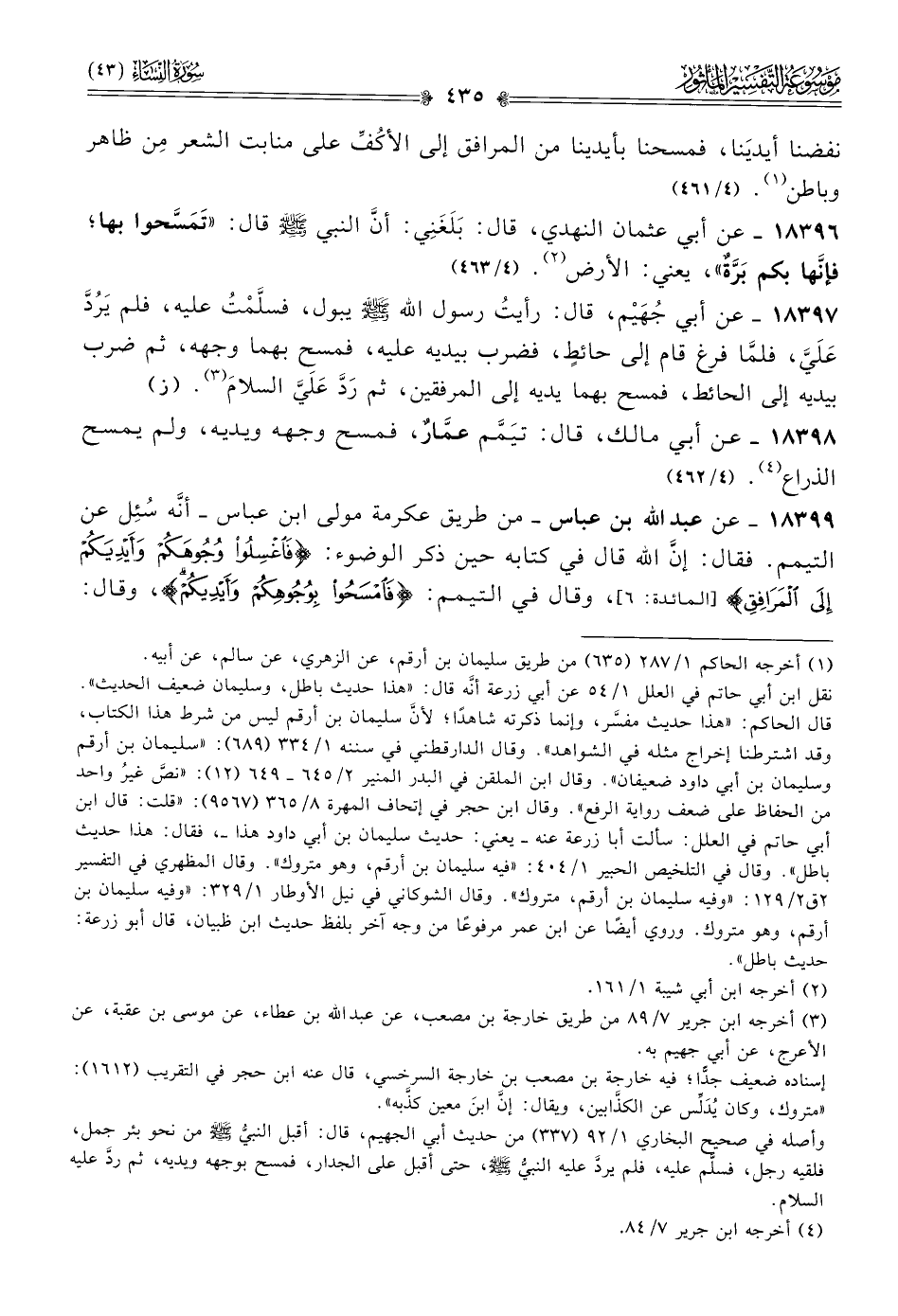 ١٨٣٩٧ - عن أبي جُهَيْم، قال: رأيتُ رسول الله - صلى الله عليه وسلم - يبول، فسلَّمْتُ عليه، فلم يَرُدَّ عَلَيَّ، فلمّا فرغ قام إلى حائطٍ، فضرب بيديه عليه، فمسح بهما وجهه، ثم ضرب بيديه إلى الحائط، فمسح بهما يديه إلى المرفقين، ثم رَدَّ عَلَيَّ السلامَ (¬٣). (ز)