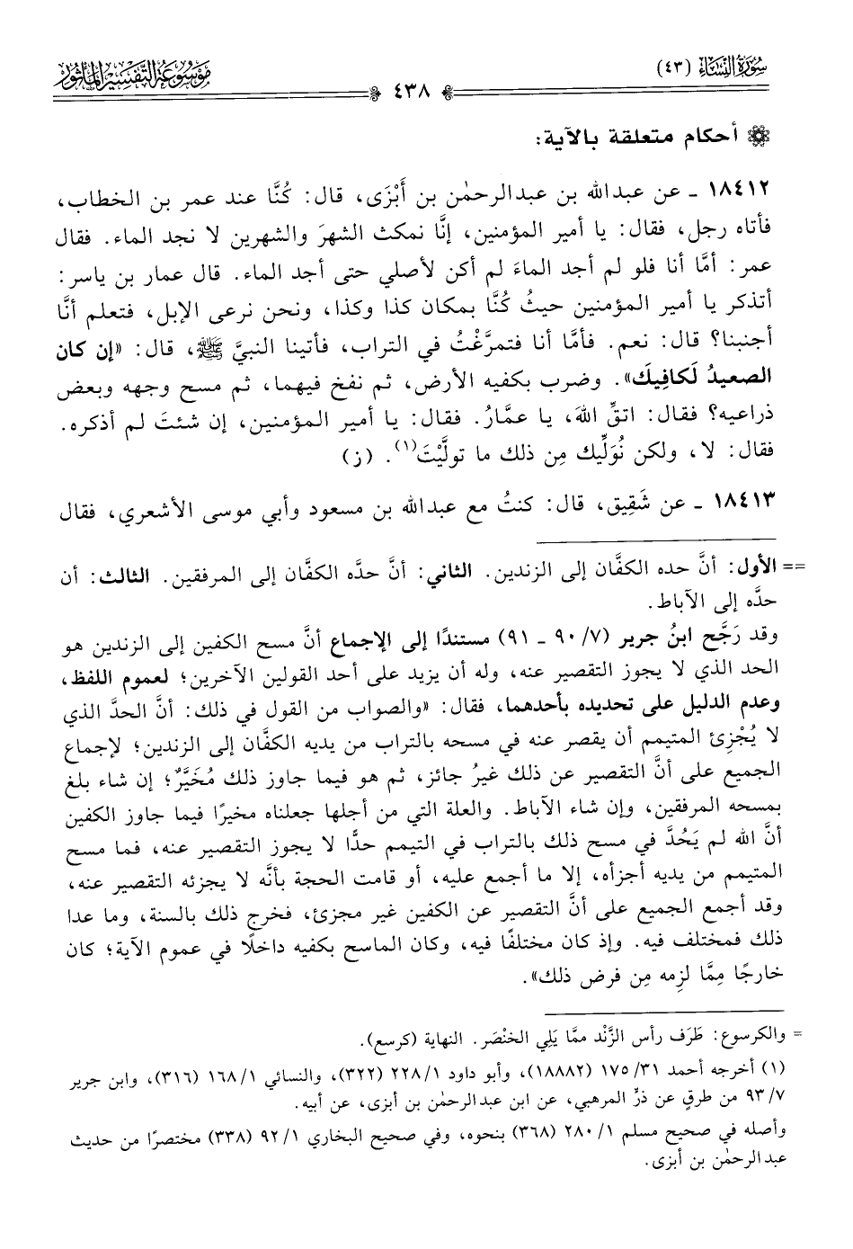 (¬١) أخرجه أحمد ٣١/ ١٧٥ (١٨٨٨٢)، وأبو داود ١/ ٢٢٨ (٣٢٢)، والنسائي ١/ ١٦٨ (٣١٦)، وابن جرير ٧/ ٩٣ من طرقٍ عن ذرٍّ المرهبي، عن ابن عبد الرحمن بن أبزى، عن أبيه.