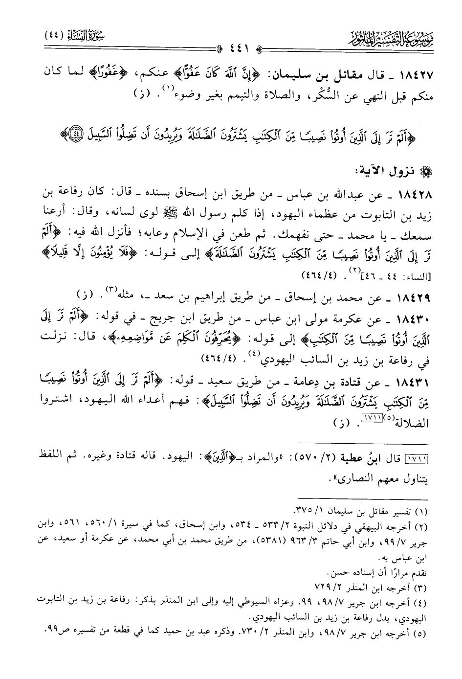 ١٨٤٣٠ - عن عكرمة مولى ابن عباس -من طريق ابن جريج- في قوله: {ألم تر إلى الذين أوتوا نصيبا من الكتاب} إلى قوله: {يحرفون الكلم عن مواضعه}، قال: نزلت في رفاعة بن زيد بن السائب اليهودي (¬٤) (٤/ ٤٦٤)