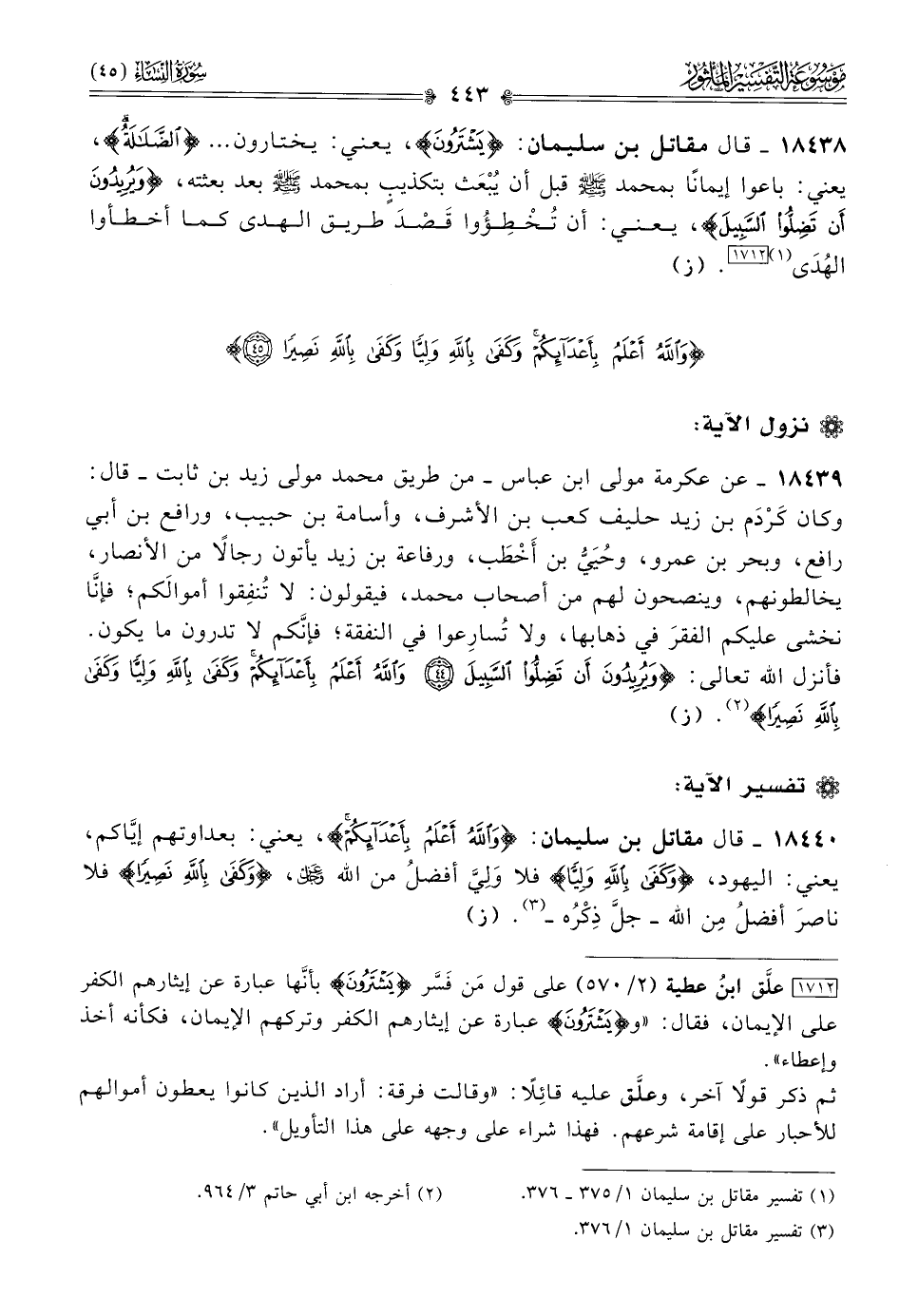 ١٨٤٤٠ - قال مقاتل بن سليمان: {والله أعلم بأعدائكم} يعني: بعداوتهم إيّاكم، يعني: اليهود، {وكفى بالله وليا} فلا ولِيَّ أفضلُ من الله - عز وجل -، {وكفى بالله نصيرا} فلا ناصرَ أفضلُ مِن الله -جلَّ ذِكْرُه- (¬٣). (ز)