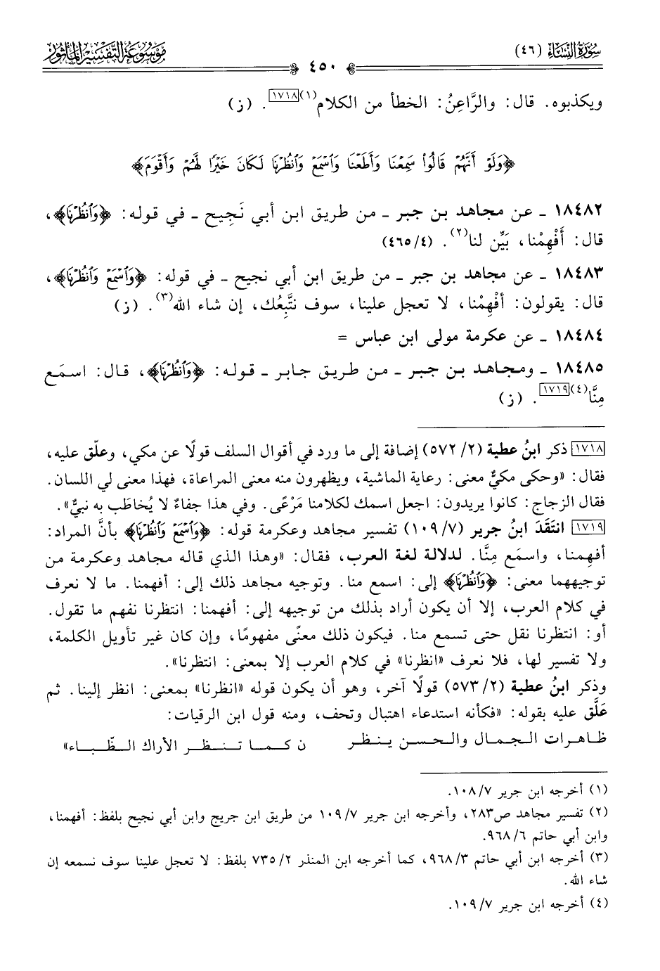 [١٧١٩] انتَقَدَ ابنُ جرير (٧/ ١٠٩) تفسير مجاهد وعكرمة قوله: {واسمع وانظرنا} بأنّ المراد: أفهِمنا، واسمَع مِنّا. لدلالة لغة العرب، فقال: «وهذا الذي قاله مجاهد وعكرمة من توجيههما معنى: {وانظرنا} إلى: اسمع منا. وتوجيه مجاهد ذلك إلى: أفهمنا. ما لا نعرف في كلام العرب، إلا أن يكون أراد بذلك من توجيهه إلى: أفهمنا: انتظرنا نفهم ما تقول. أو: انتظرنا نقل حتى تسمع منا. فيكون ذلك معنًى مفهومًا، وإن كان غير تأويل الكلمة، ولا تفسير لها، فلا نعرف» انظرنا «في كلام العرب إلا بمعنى: انتظرنا».
