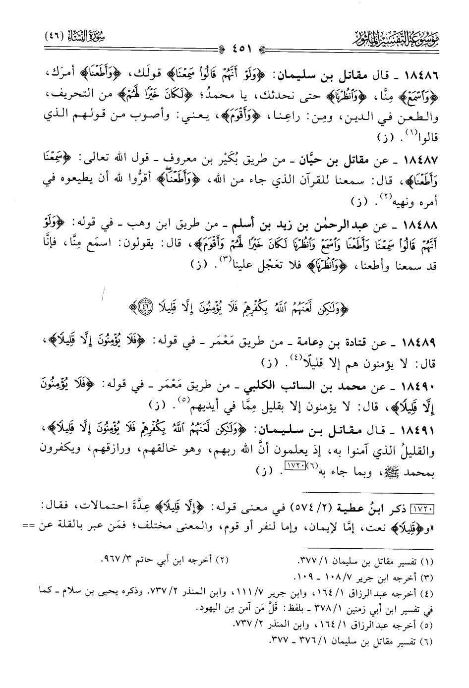 ١٨٤٩١ - قال مقاتل بن سليمان: {ولكن لعنهم الله بكفرهم فلا يؤمنون إلا قليلا}، والقليلُ الذي آمنوا به، إذ يعلمون أنّ الله ربهم، وهو خالقهم، ورازقهم، ويكفرون بمحمد - صلى الله عليه وسلم -، وبما جاء به (¬٦) [١٧٢٠]. (ز)