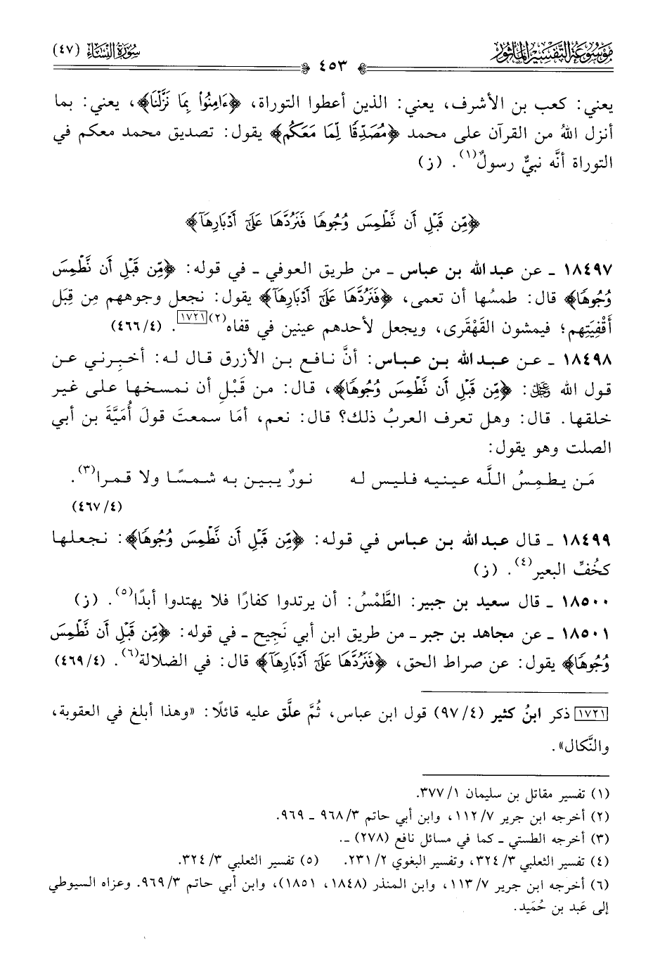 ١٨٤٩٩ - قال عبد الله بن عباس في قوله: {من قبل أن نطمس وجوها}: نجعلها كخُفِّ البعير (¬٤). (ز)