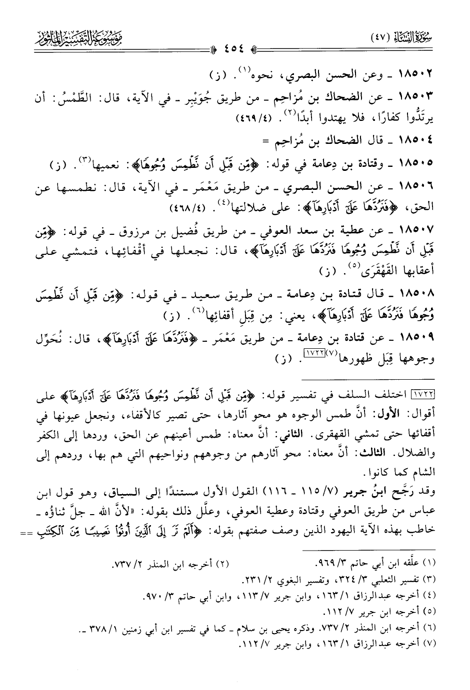 [١٧٢٢] اختلف السلف في تفسير قوله: {من قبل أن نطمس وجوها فنردها على أدبارها} على أقوال: الأول: أنّ طمس الوجوه هو محو آثارها، حتى تصير كالأقفاء، ونجعل عيونها في أقفائها حتى تمشي القهقرى. الثاني: أنّ معناه: طمس أعينهم عن الحق، وردها إلى الكفر والضلال. الثالث: أنّ معناه: محو آثارهم من وجوههم ونواحيهم التي هم بها، وردهم إلى الشام كما كانوا.