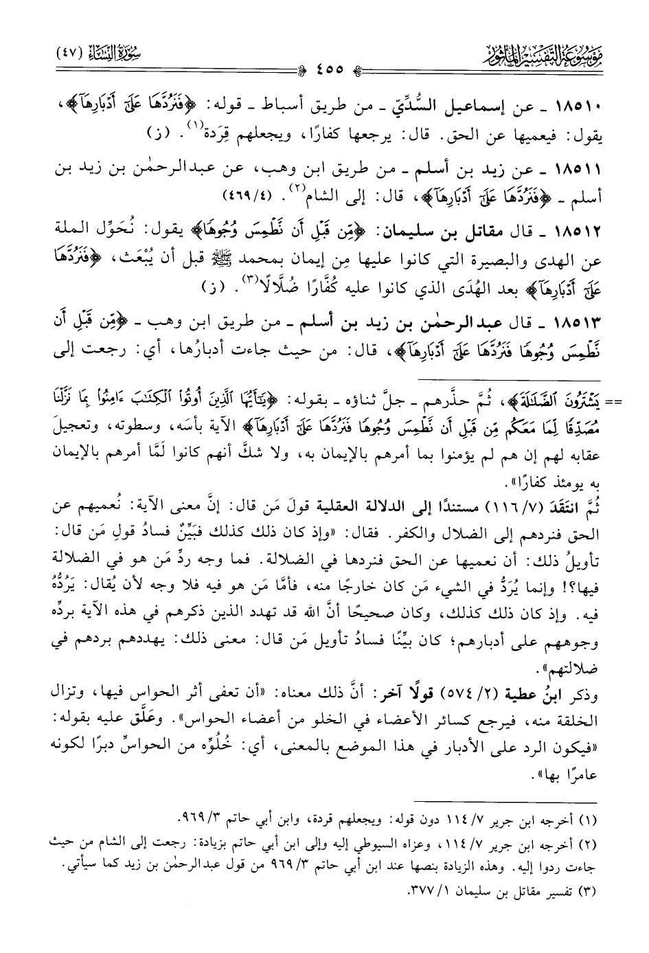 ١٨٥١٣ - قال عبد الرحمن بن زيد بن أسلم -من طريق ابن وهب- {من قبل أن نطمس وجوها فنردها على أدبارها}، قال: من حيث جاءت أدبارُها، أي: رجعت إلى
