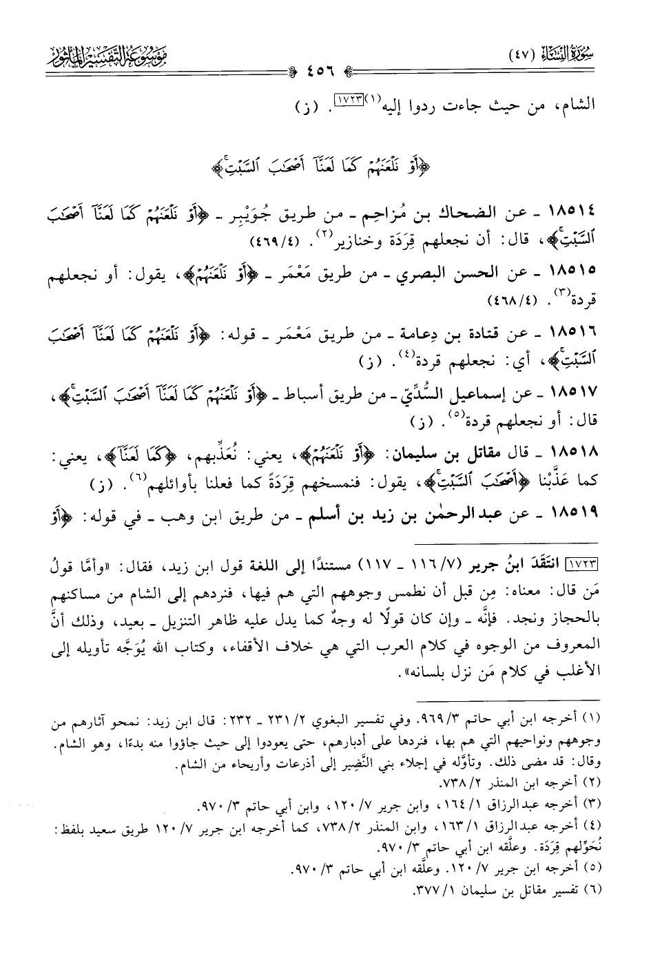 ١٨٥١٤ - عن الضحاك بن مُزاحِم -من طريق جُوَيْبِر- {أو نلعنهم كما لعنا أصحاب السبت}، قال: أن نجعلهم قِرَدَة وخنازير (¬٢). (٤/ ٤٦٩)