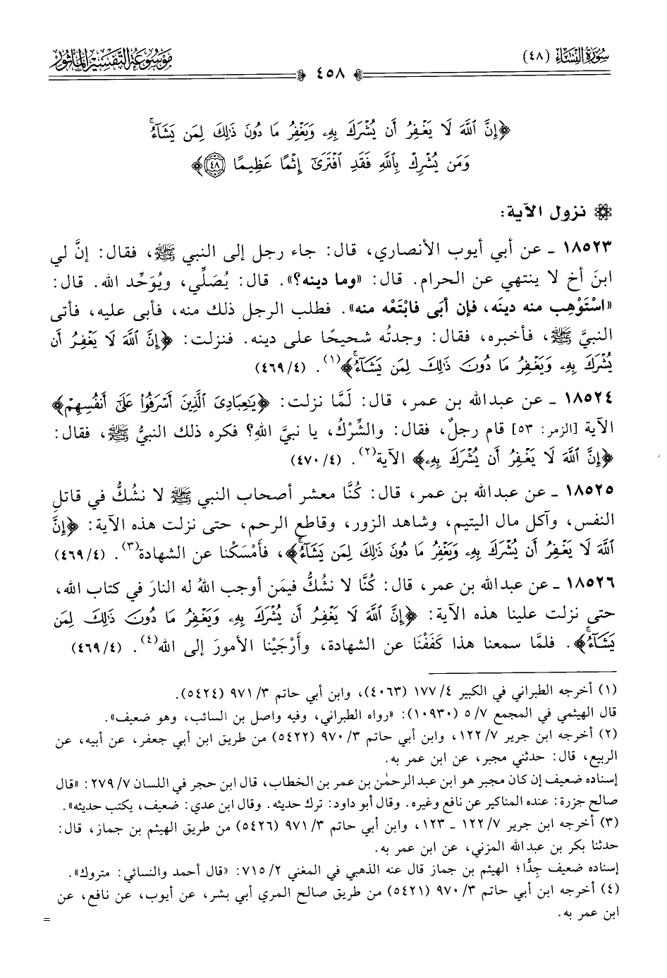 ١٨٥٢٥ - عن عبد الله بن عمر، قال: كُنّا معشر أصحاب النبي - صلى الله عليه وسلم - لا نشُكُّ في قاتلِ النفس، وآكل مال اليتيم، وشاهد الزور، وقاطع الرحم، حتى نزلت هذه الآية: {إن الله لا يغفر أن يشرك به ويغفر ما دون ذلك لمن يشاء}، فأَمْسَكْنا عن الشهادة (¬٣). (٤/ ٤٦٩)