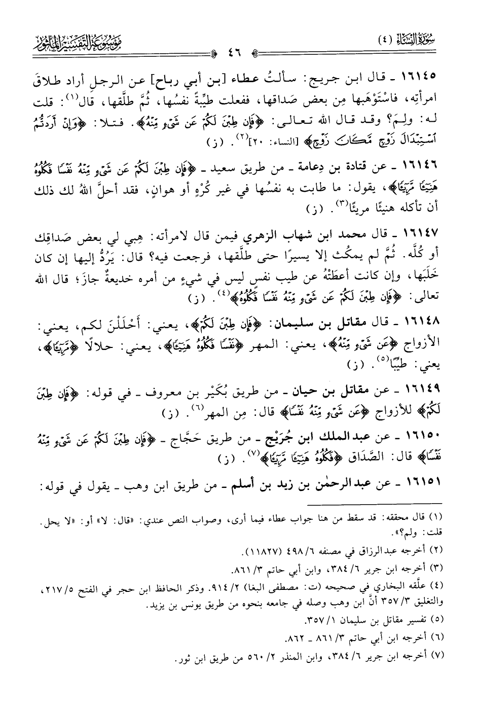١٦١٥٠ - عن عبد الملك ابن جُرَيْج -من طريق حَجّاج- {فإن طبن لكم عن شيء منه نفسا} قال: الصَّداق {فكلوه هنيئا مريئا} (¬٧). (ز)