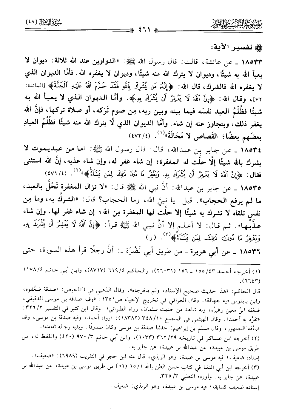 ١٨٥٣٤ - عن جابر بن عبد الله، قال: قال رسول الله - صلى الله عليه وسلم -: «ما من عبد يموت لا يشرك بالله شيئًا إلّا حلَّت له المغفرة؛ إن شاء غفر له، وإن شاء عذبه، إنّ الله استثنى فقال: {إن الله لا يغفر أن يشرك به ويغفر ما دون ذلك لمن يشاء}» (¬٢). (٤/ ٤٧١)