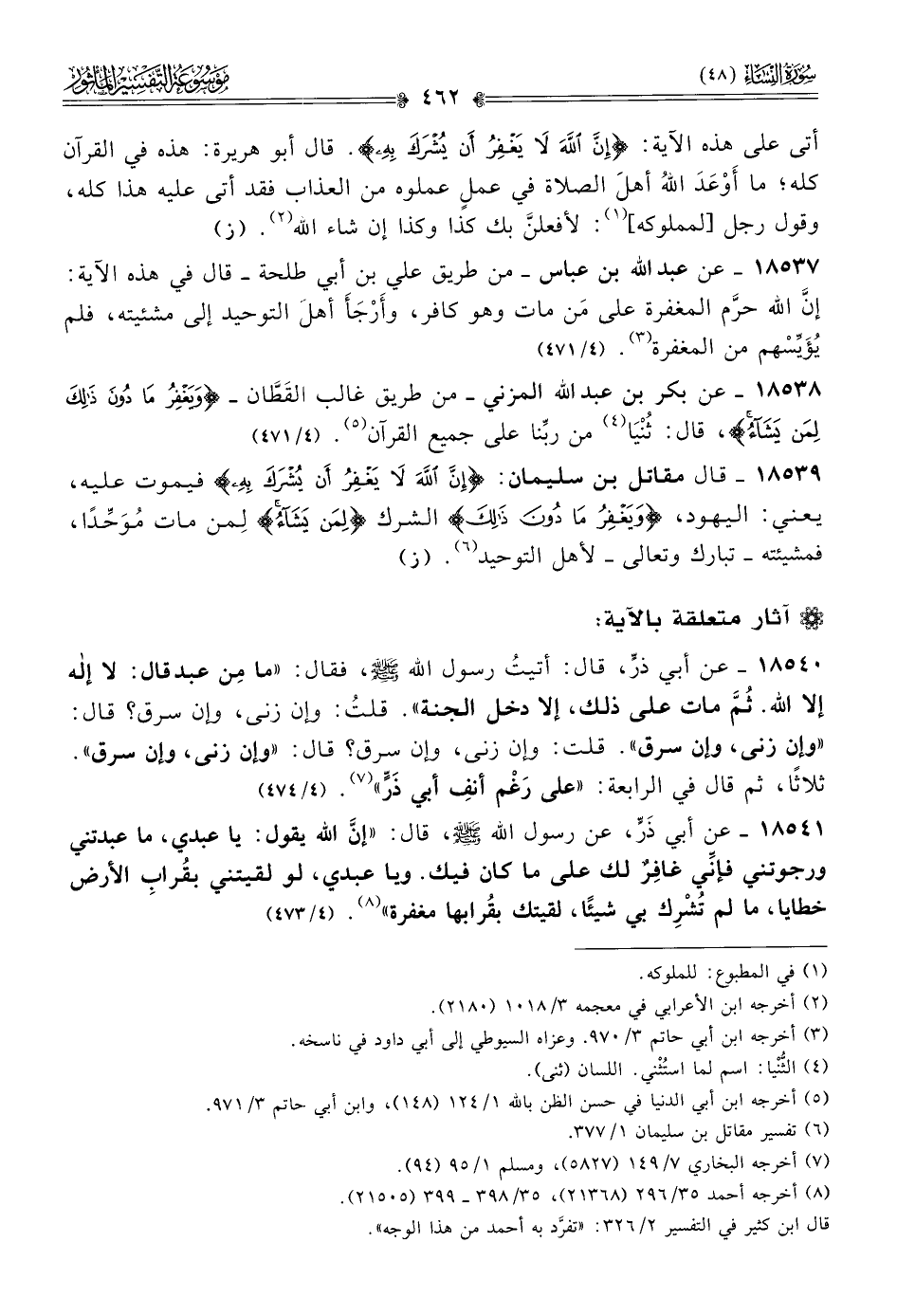 أتى على هذه الآية: {إن الله لا يغفر أن يشرك به}. قال أبو هريرة: هذه في القرآن كله؛ ما أوْعَدَ اللهُ أهلَ الصلاة في عملٍ عملوه من العذاب فقد أتى عليه هذا كله، وقول رجل [لمملوكه] (¬١): لأفعلنَّ بك كذا وكذا إن شاء الله (¬٢). (ز)