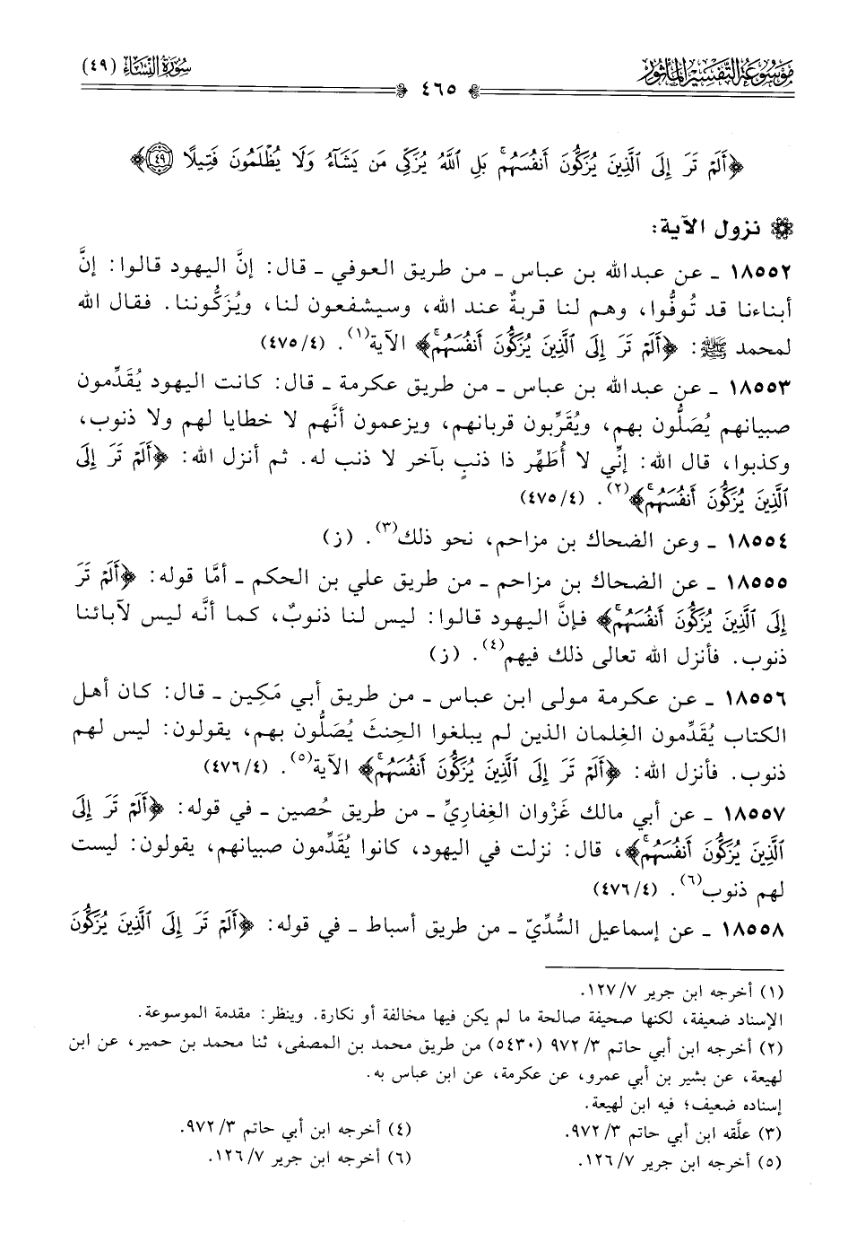 ١٨٥٥٢ - عن عبد الله بن عباس -من طريق العوفي- قال: إنّ اليهود قالوا: إنّ أبناءنا قد تُوفُّوا، وهم لنا قربةٌ عند الله، وسيشفعون لنا، ويُزَكُّوننا. فقال الله لمحمد - صلى الله عليه وسلم -: {ألم تر إلى الذين يزكون أنفسهم} الآية (¬١). (٤/ ٤٧٥)