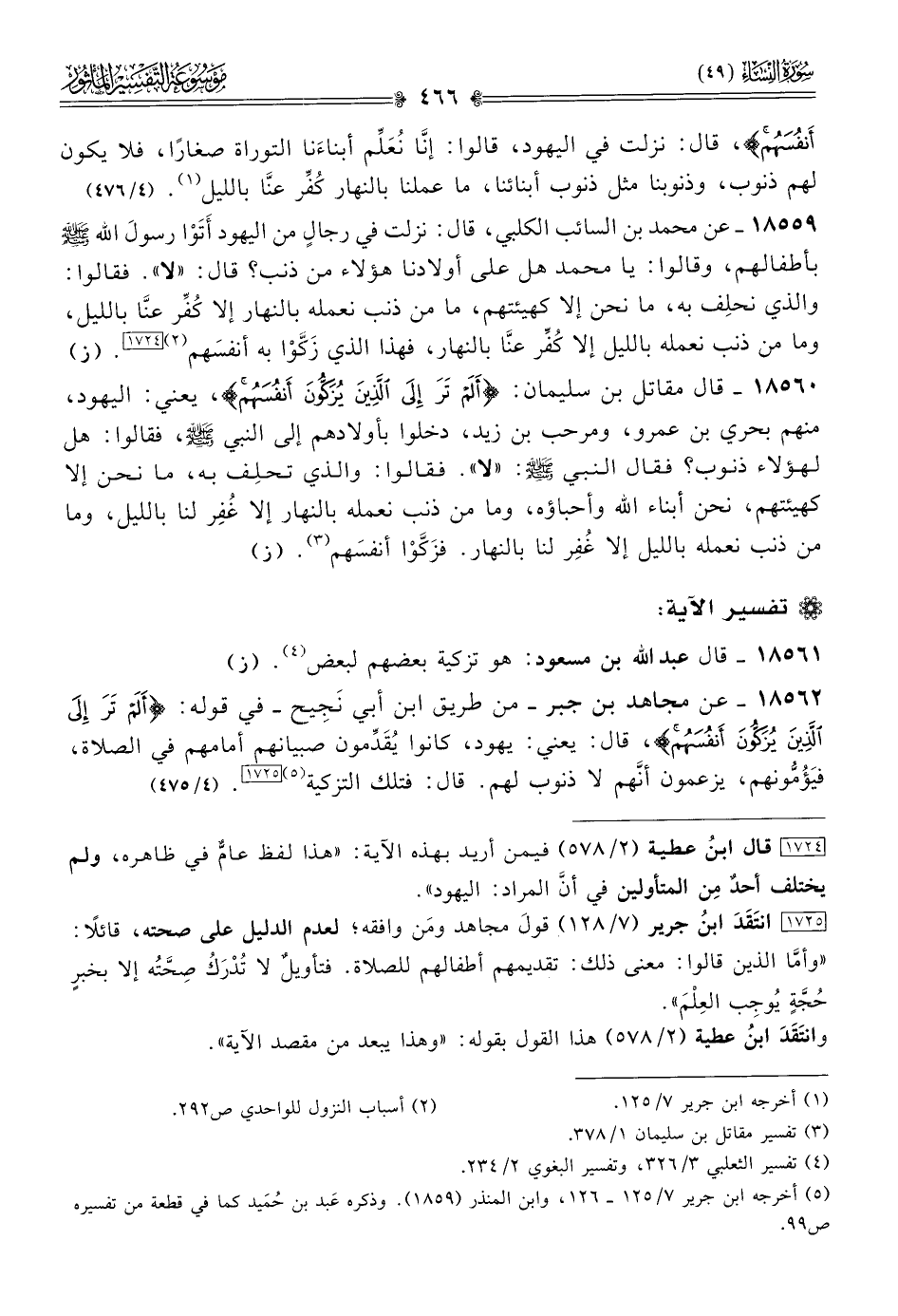 ١٨٥٥٩ - عن محمد بن السائب الكلبي، قال: نزلت في رجالٍ من اليهود أتَوْا رسول الله - صلى الله عليه وسلم - بأطفالهم، وقالوا: يا محمد هل على أولادنا هؤلاء من ذنب؟ قال: «لا». فقالوا: والذي نحلِف به، ما نحن إلا كهيئتهم، ما من ذنب نعمله بالنهار إلا كُفِّر عنّا بالليل، وما من ذنب نعمله بالليل إلا كُفِّر عنّا بالنهار، فهذا الذي زَكَّوْا به أنفسَهم (¬٢) [١٧٢٤]. (ز)