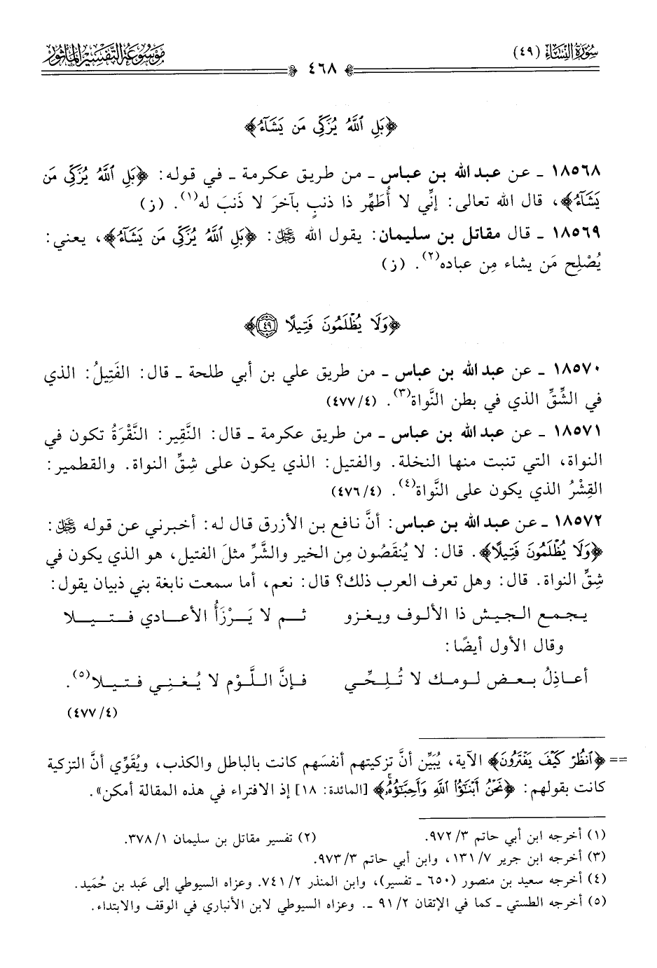 ١٨٥٧٢ - عن عبد الله بن عباس: أنّ نافع بن الأزرق قال له: أخبرني عن قوله - عز وجل -: {ولا يظلمون فتيلا}. قال: لا يُنقَصُون مِن الخير والشَّرِّ مثلَ الفتيل، هو الذي يكون في شِقِّ النواة. قال: وهل تعرف العرب ذلك؟ قال: نعم، أما سمعت نابغة بني ذبيان يقول: