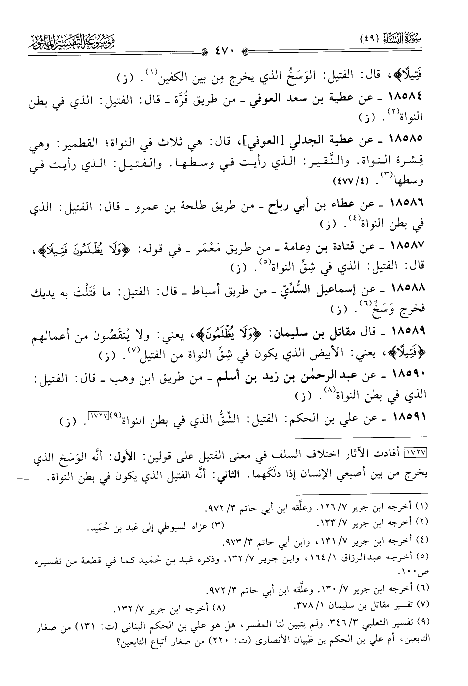 [١٧٢٧] أفادت الآثار اختلاف السلف في معنى الفتيل على قولين: الأول: أنّه الوَسَخ الذي يخرج من بين أصبعي الإنسان إذا دلَكَهما. الثاني: أنّه الفتيل الذي يكون في بطن النواة.