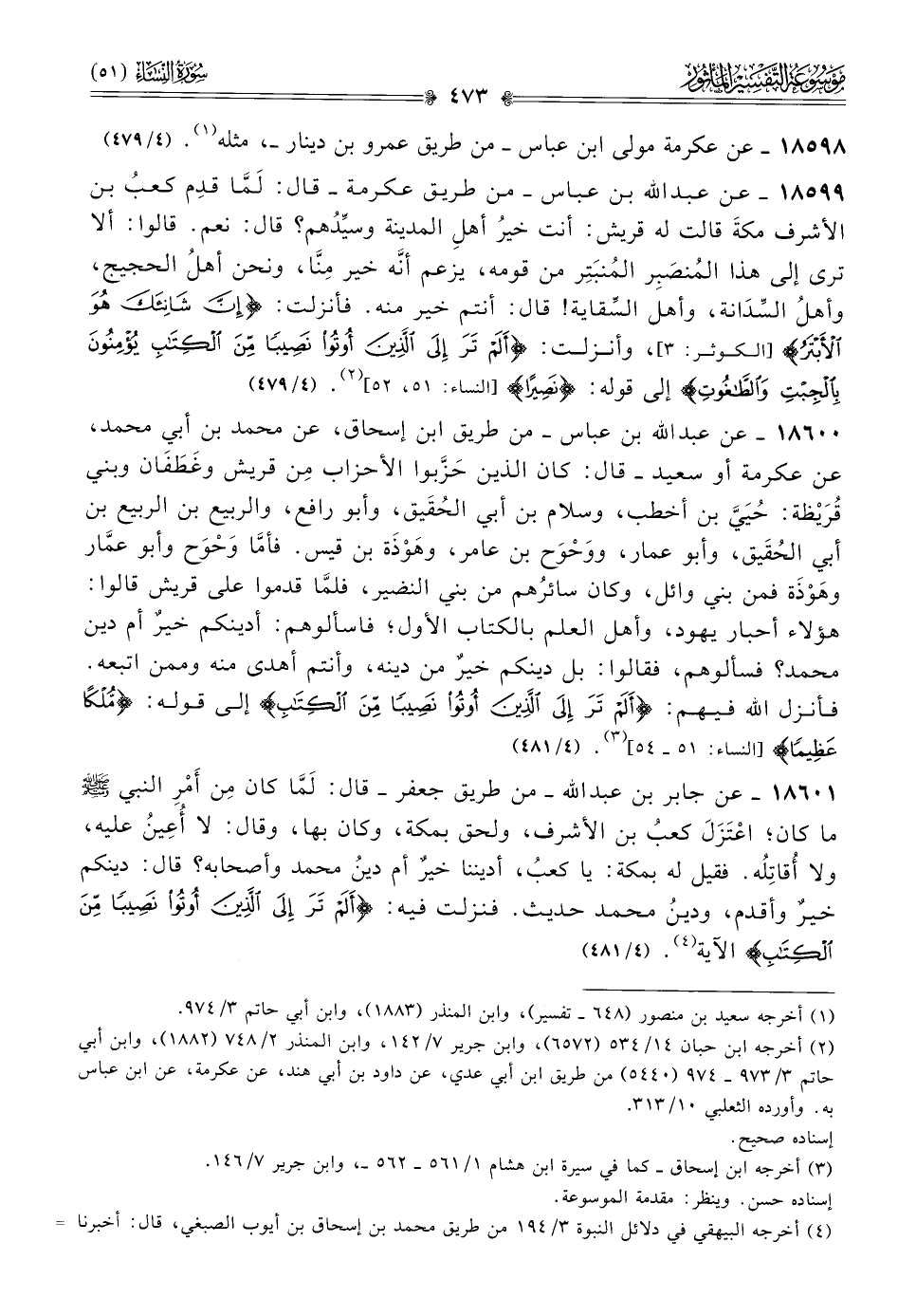١٨٥٩٩ - عن عبد الله بن عباس -من طريق عكرمة- قال: لَمّا قدِم كعبُ بن الأشرف مكةَ قالت له قريش: أنت خيرُ أهلِ المدينة وسيِّدُهم؟ قال: نعم. قالوا: ألا ترى إلى هذا المُنصَبِر المُنبَتِر من قومه، يزعم أنّه خير مِنّا، ونحن أهلُ الحجيج، وأهلُ السِّدانة، وأهل السِّقاية! قال: أنتم خير منه. فأنزلت: {إن شائنك هو الأبتر} [الكوثر: ٣]، وأنزلت: {ألم تر إلى الذين أوتوا نصيبا من الكتاب يؤمنون بالجبت والطاغوت} إلى قوله: {نصيرا} (¬٢). (٤/ ٤٧٩)