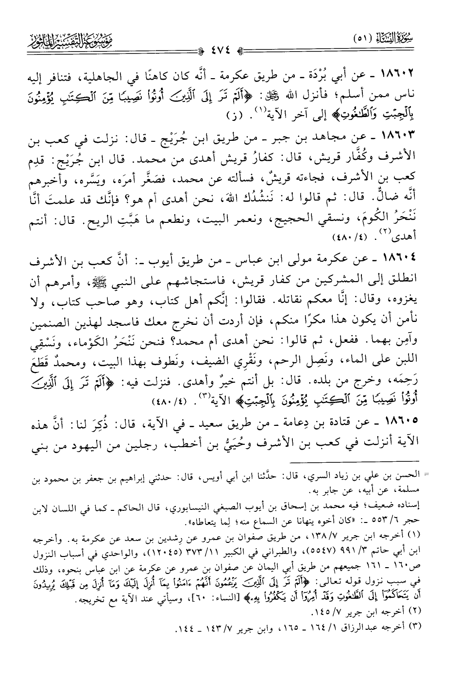 ١٨٦٠٤ - عن عكرمة مولى ابن عباس -من طريق أيوب- أنّ كعب بن الأشرف انطلق إلى المشركين من كفار قريش، فاستجاشهم على النبي - صلى الله عليه وسلم -، وأمرهم أن يغزوه، وقال: إنّا معكم نقاتله. فقالوا: إنّكم أهل كتاب، وهو صاحب كتاب، ولا نأمن أن يكون هذا مكرًا منكم، فإن أردت أن نخرج معك فاسجد لهذين الصنمين وآمِن بهما. ففعل، ثم قالوا: نحن أهدى أم محمد؟ فنحن نَنْحَرُ الكَوْماء، ونَسْقِي اللبن على الماء، ونَصِل الرحم، ونَقْرِي الضيف، ونَطوف بهذا البيت، ومحمدٌ قَطَعَ رَحِمَه، وخرج من بلده. قال: بل أنتم خيرٌ وأهدى. فنزلت فيه: {ألم تر إلى الذين أوتوا نصيبا من الكتاب يؤمنون بالجبت} الآية (¬٣). (٤/ ٤٨٠)