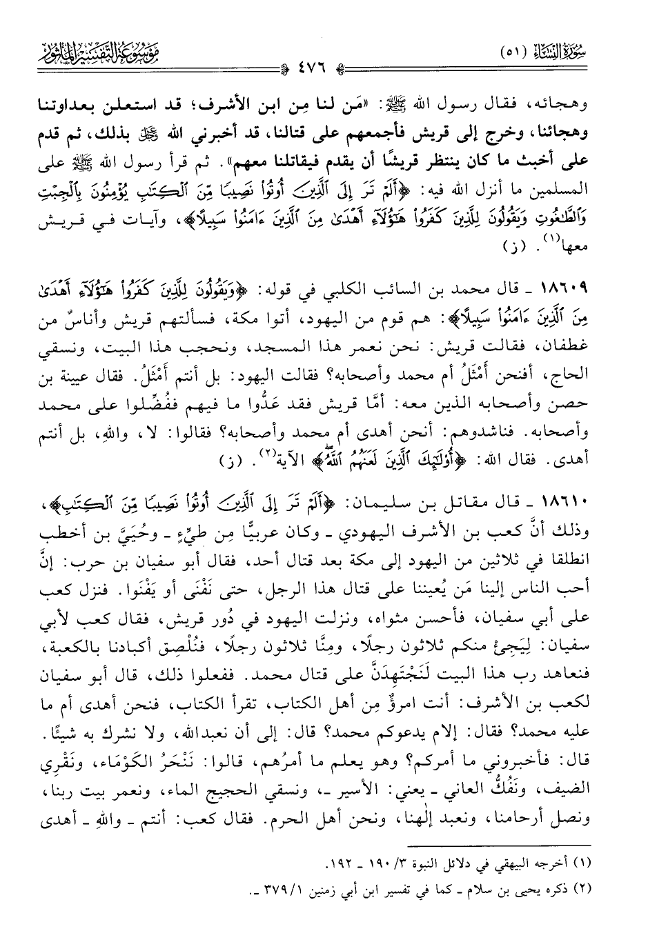 ١٨٦١٠ - قال مقاتل بن سليمان: {ألم تر إلى الذين أوتوا نصيبا من الكتاب}، وذلك أنّ كعب بن الأشرف اليهودي -وكان عربيًّا مِن طيِّءٍ- وحُيَيَّ بن أخطب انطلقا في ثلاثين من اليهود إلى مكة بعد قتال أحد، فقال أبو سفيان بن حرب: إنّ أحب الناس إلينا مَن يُعيننا على قتال هذا الرجل، حتى نَفْنى أو يَفْنَوا. فنزل كعب على أبى سفيان، فأحسن مثواه، ونزلت اليهود في دُور قريش، فقال كعب لأبي سفيان: لِيَجِئْ منكم ثلاثون رجلًا، ومِنّا ثلاثون رجلًا، فنُلْصِق أكبادنا بالكعبة، فنعاهد رب هذا البيت لَنَجْتَهِدَنَّ على قتال محمد. ففعلوا ذلك، قال أبو سفيان لكعب بن الأشرف: أنت امرؤٌ مِن أهل الكتاب، تقرأ الكتاب، فنحن أهدى أم ما عليه محمد؟ فقال: إلام يدعوكم محمد؟ قال: إلى أن نعبد الله، ولا نشرك به شيئًا. قال: فأخبروني ما أمركم؟ وهو يعلم ما أمرُهم، قالوا: نَنْحَرُ الكَوْماء، ونَقْرِي الضيف، ونَفُكُّ العاني -يعني: الأسير-، ونسقي الحجيج الماء، ونعمر بيت ربنا، ونصل أرحامنا، ونعبد إلهنا، ونحن أهل الحرم. فقال كعب: أنتم -واللهِ- أهدى