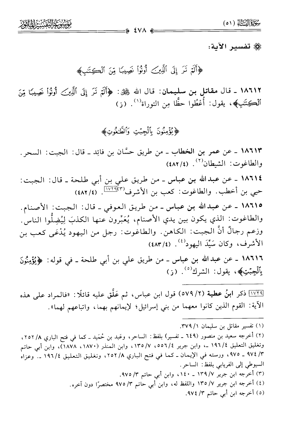 ١٨٦١٥ - عن عبد الله بن عباس -من طريق العوفي- قال: الجبت: الأصنام. والطاغوت: الذي يكون بين يدي الأصنام، يُعَبِّرون عنها الكذبَ لِيُضِلُّوا الناس. وزعم رجالٌ أنّ الجبت: الكاهن. والطاغوت: رجل من اليهود يُدْعى كعب بن الأشرف، وكان سَيِّدَ اليهود (¬٤). (٤/ ٤٨٣)