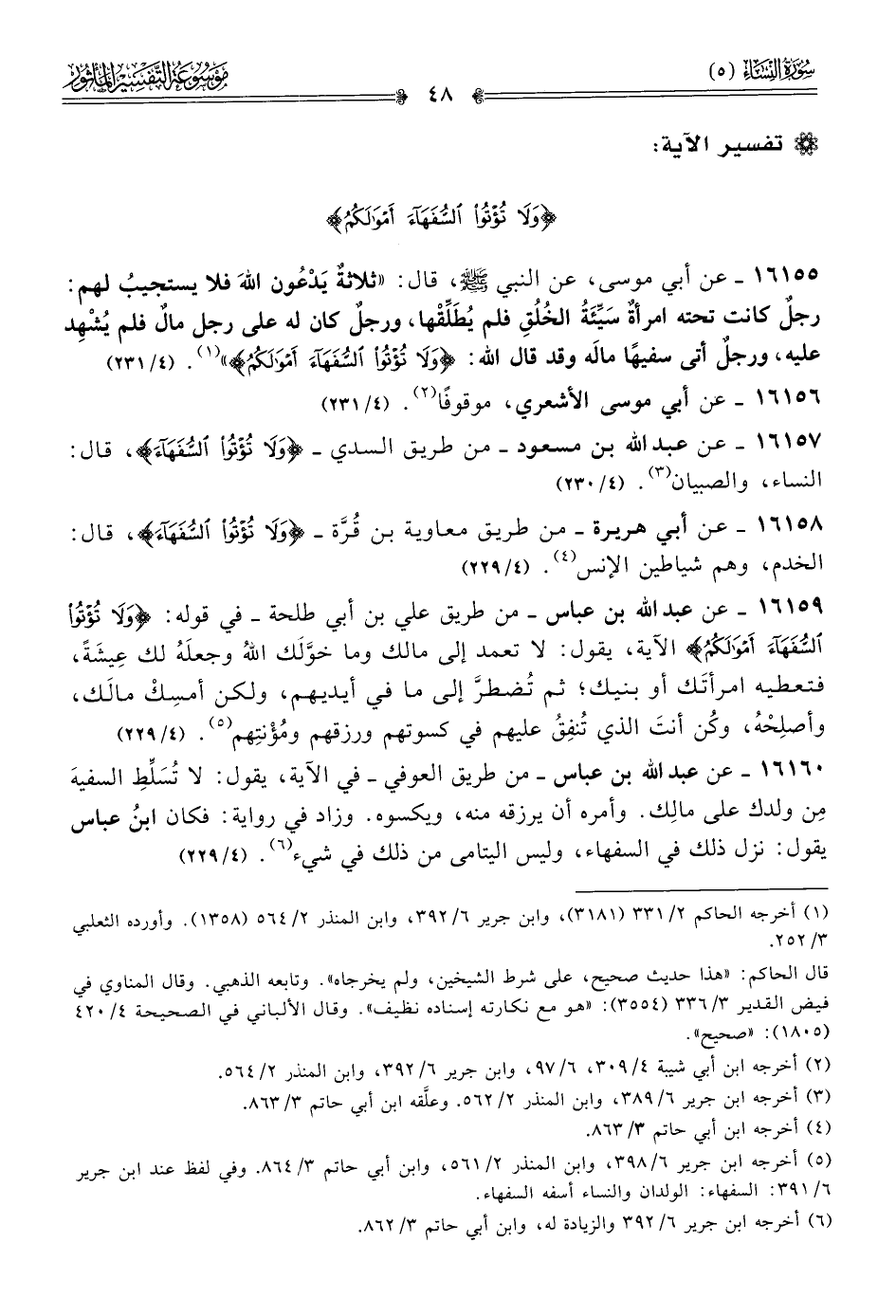 (¬٥) أخرجه ابن جرير ٦/ ٣٩٨، وابن المنذر ٢/ ٥٦١، وابن أبي حاتم ٣/ ٨٦٤. وفي لفظ عند ابن جرير ٦/ ٣٩١: السفهاء: الولدان والنساء أسفه السفهاء.