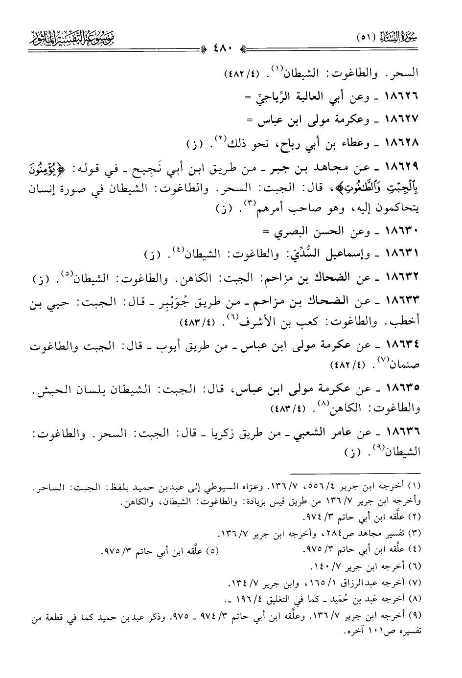١٨٦٣٥ - عن عكرمة مولى ابن عباس، قال: الجبت: الشيطان بلسان الحبش. والطاغوت: الكاهن (¬٨). (٤/ ٤٨٣)