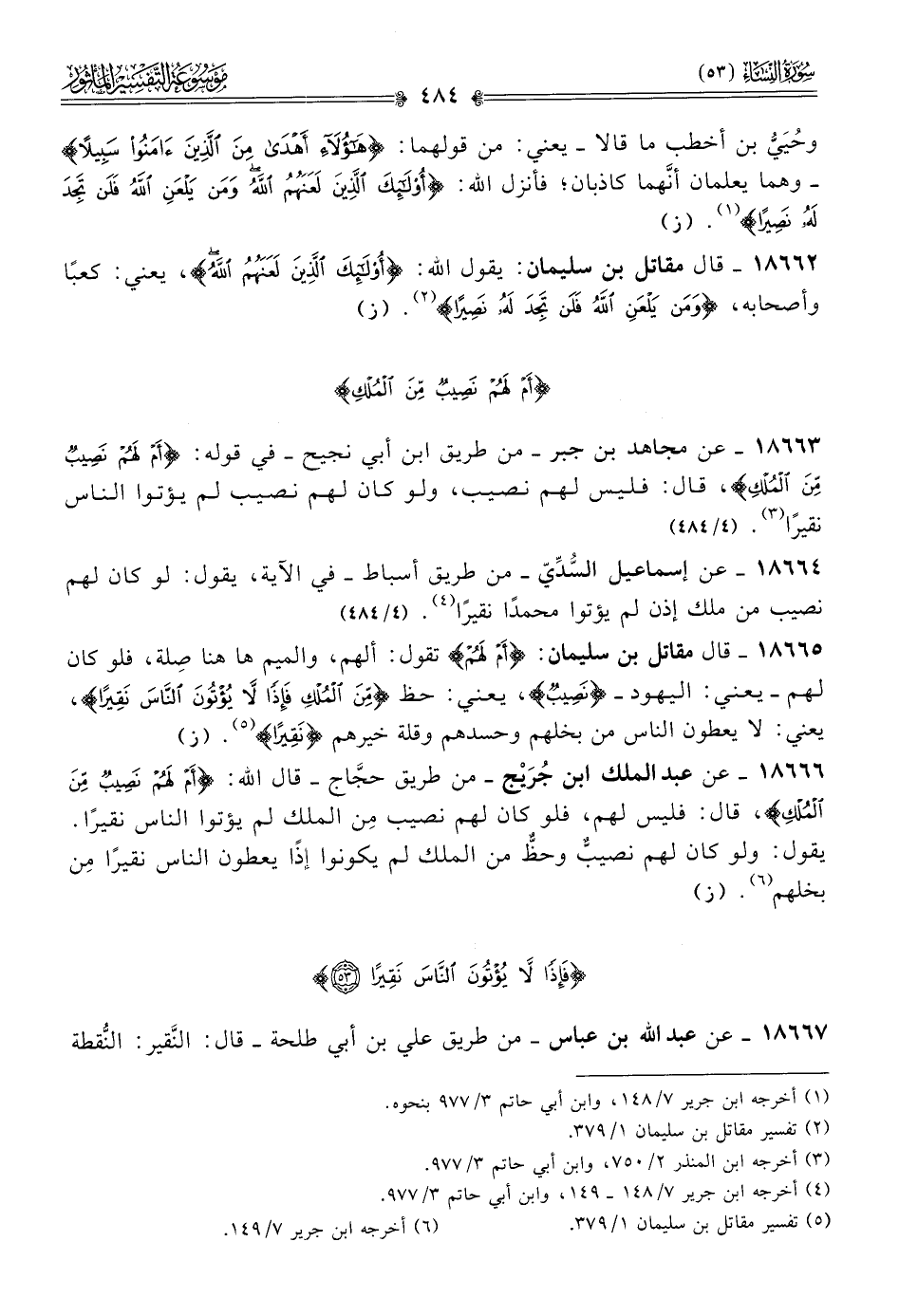 ١٨٦٦٦ - عن عبد الملك ابن جُرَيْج -من طريق حجّاج- قال الله: {أم لهم نصيب من الملك}، قال: فليس لهم، فلو كان لهم نصيب مِن الملك لم يؤتوا الناس نقيرًا. يقول: ولو كان لهم نصيبٌّ وحظٌّ من الملك لم يكونوا إذًا يعطون الناس نقيرًا مِن بخلهم (¬٦). (ز)