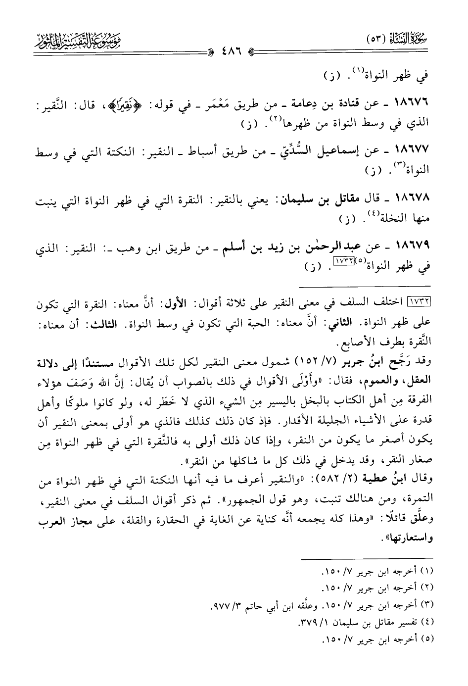 [١٧٣٢] اختلف السلف في معنى النقير على ثلاثة أقوال: الأول: أنّ معناه: النقرة التي تكون على ظهر النواة. الثاني: أنّ معناه: الحبة التي تكون في وسط النواة. الثالث: أن معناه: النَّقرة بطرف الأصابع.