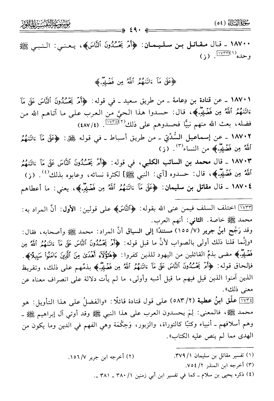 ١٨٧٠٠ - قال مقاتل بن سليمان: {أم يحسدون الناس}، يعني: النبي - صلى الله عليه وسلم - وحده (¬١) [١٧٣٣]. (ز)