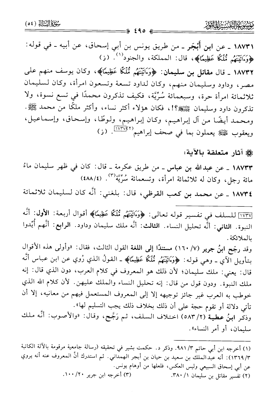 ١٨٧٣٢ - قال مقاتل بن سليمان: {وآتيناهم ملكا عظيما}، وكان يوسف منهم على مصر، وداود وسليمان منهم، وكان لداود تسعة وتسعون امرأة، وكان لسليمان ثلاثمائة امرأة حرة، وسبعمائة سُرِّيَّة، فكيف تذكرون محمدًا في تسع نسوة، ولا تذكرون داود وسليمان?؟!، فكان هؤلاء أكثر نساء، وأكثر ملكًا من محمد - صلى الله عليه وسلم -. ومحمد أيضًا من آل إبراهيم، وكان إبراهيم، ولوطًا، وإسحاق، وإسماعيل، ويعقوب? يعملون بما في صحف إبراهيم (¬٢) [١٧٣٧]. (ز)