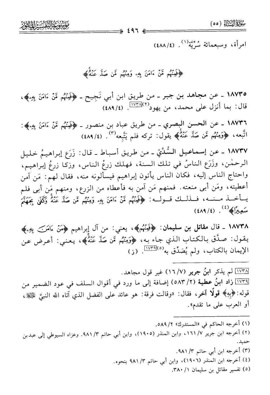 ١٨٧٣٥ - عن مجاهد بن جبر -من طريق ابن أبي نَجِيح- {فمنهم من ءامن به}، قال: بما أنزل على محمد، من يهود (¬٢) [١٧٣٨]. (٤/ ٤٨٩)
