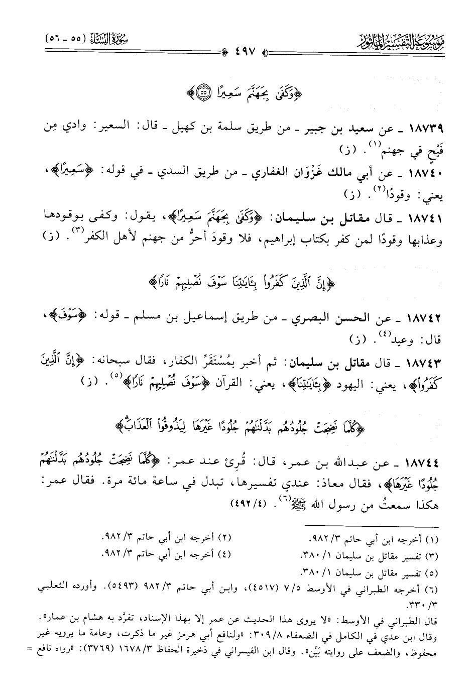 ١٨٧٤٤ - عن عبد الله بن عمر، قال: قُرِئ عند عمر: {كلما نضجت جلودهم بدلناهم جلودا غيرها}، فقال معاذ: عندي تفسيرها، تبدل في ساعة مائة مرة. فقال عمر: هكذا سمعتُ من رسول الله - صلى الله عليه وسلم - (¬٦). (٤/ ٤٩٢)