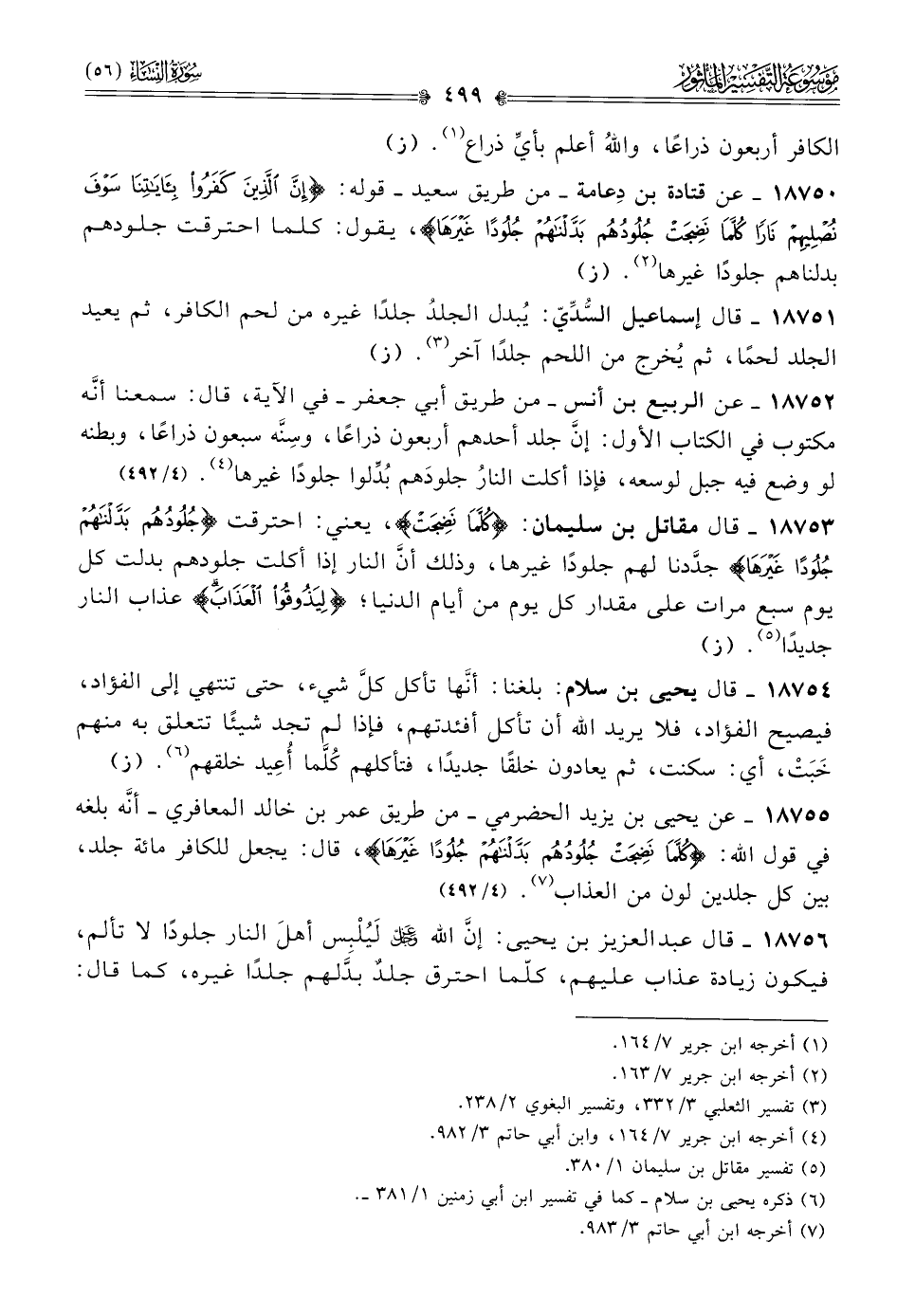 ١٨٧٥٥ - عن يحيى بن يزيد الحضرمي -من طريق عمر بن خالد المعافري- أنّه بلغه في قول الله: {كلما نضجت جلودهم بدلناهم جلودا غيرها}، قال: يجعل للكافر مائة جلد، بين كل جلدين لون من العذاب (¬٧). (٤/ ٤٩٢)