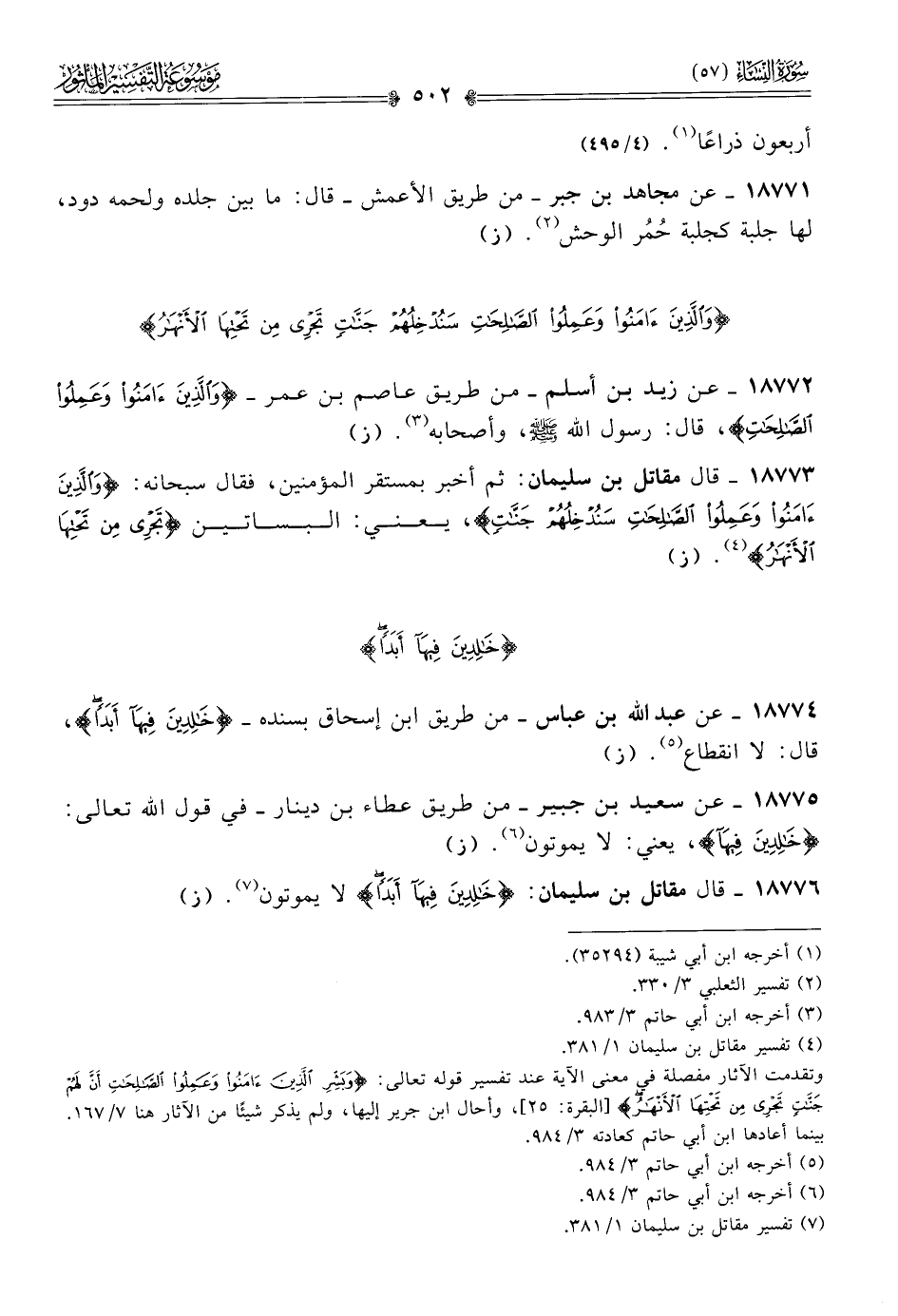 ١٨٧٧٦ - قال مقاتل بن سليمان: {خالدين فيها أبدا} لا يموتون (¬٧). (ز)