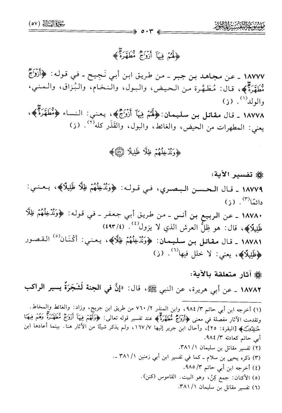 ١٨٧٨١ - قال مقاتل بن سليمان: {وندخلهم ظلا} يعني: أكْنان (¬٥) القصور {ظليلا} يعني: لا خلل فيها (¬٦). (ز)