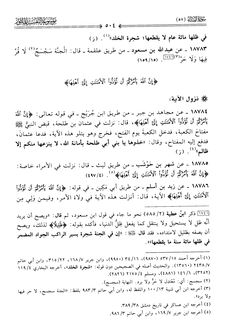 ١٨٧٨٤ - عن مجاهد بن جبر -من طريق ابن جُرَيْج- في قوله تعالى: {إن الله يأمركم أن تؤدوا الأمانات إلى أهلها}، قال: نزلت في عثمان بن طلحة، قبض النبي - صلى الله عليه وسلم - مفتاحَ الكعبة، فدخل الكعبةَ يوم الفتح، فخرج وهو يتلو هذه الآية، فدعا عثمانَ، فدفع إليه المفتاح، وقال: «خذوها يا بني أبي طلحة بأمانة الله، لا ينزعها منكم إلا ظالم» (¬٤). (ز)