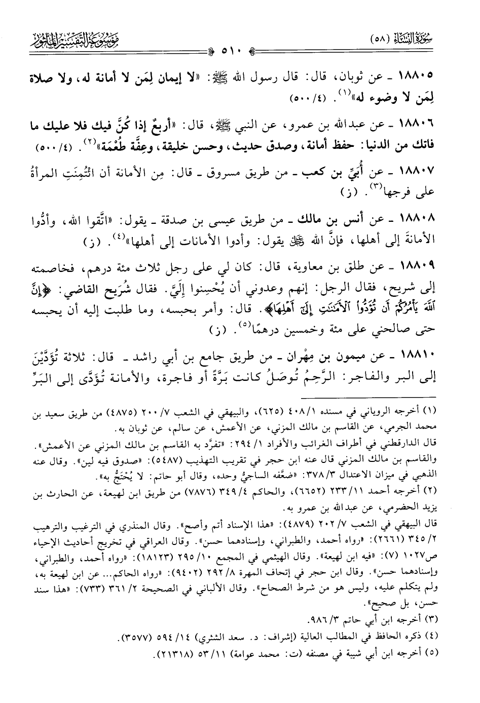 ١٨٨٠٨ - عن أنس بن مالك -من طريق عيسى بن صدقة- يقول: «اتَّقوا الله، وأدُّوا الأمانةَ إلى أهلها، فإنّ الله - عز وجل - يقول: وأدوا الأمانات إلى أهلها» (¬٤). (ز)